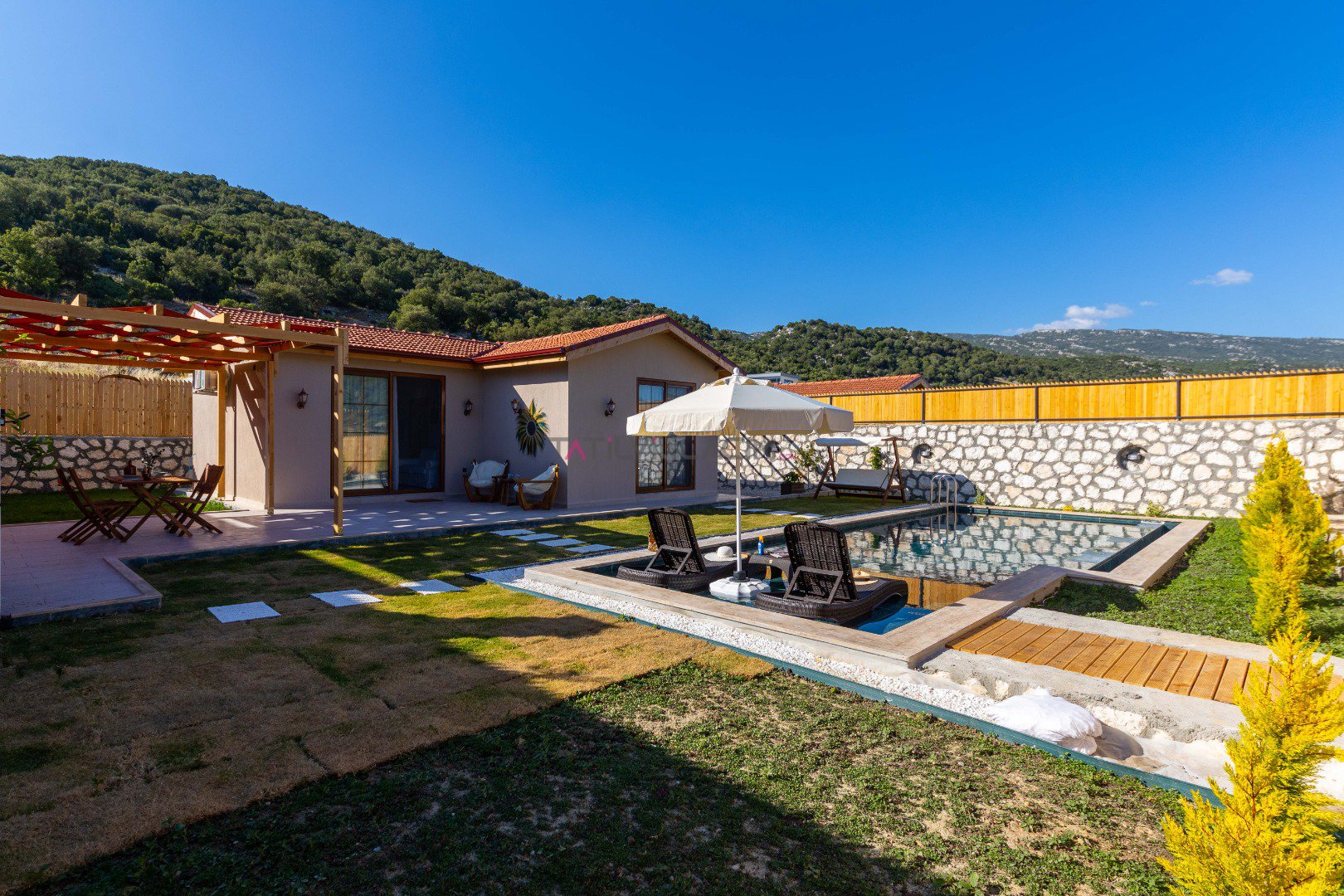Villa Özellikleri Barbekü (Mangal) Bardak Takımı Bulaşık Makinası Buzdolabı Çamaşır Makinası Dağ Doğa 1 Çift Kişilik Yatak Amerikan Mutfak Ankastre 4 lü Ocak Ankastre Fırın Full Eşyalı ve Mobilyalı Havuz Terasına Çıkış İnternet Bağlantısı Kablosuz Modem Kaşık Çatal Bıçak Takımı Klima Oturma Grubu Özel Bahçeli Özel Havuz Sandalyeler Sehpa Şemsiye Şezlong Su Isıtıcısı Tencere ve Tava Takımı TV Uydu Alıcı Yemek Masası Yemek Takımı Jakuzi Barbekü Doğa Manzaralı Bahçeli