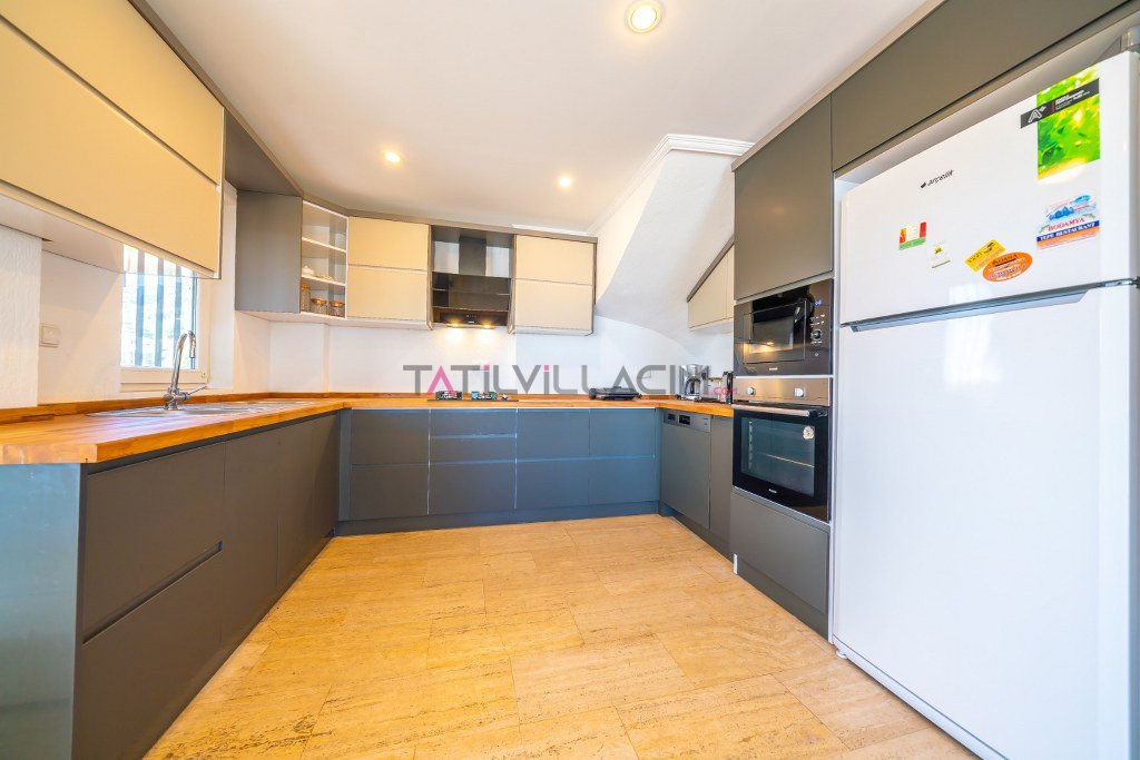 Korunaklı havuz alanına sahip olan villamızın geniş havuz terasında oturma alanı, barbekü ve bahçe salıncağı bulunuyor.