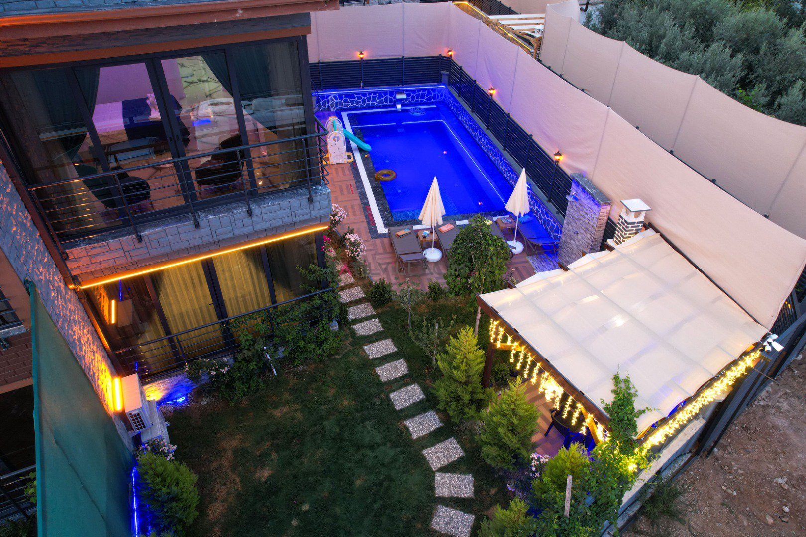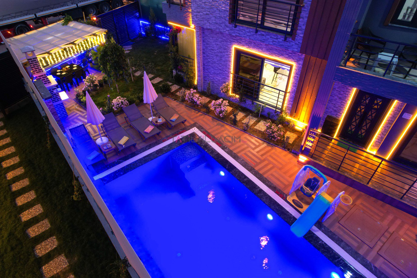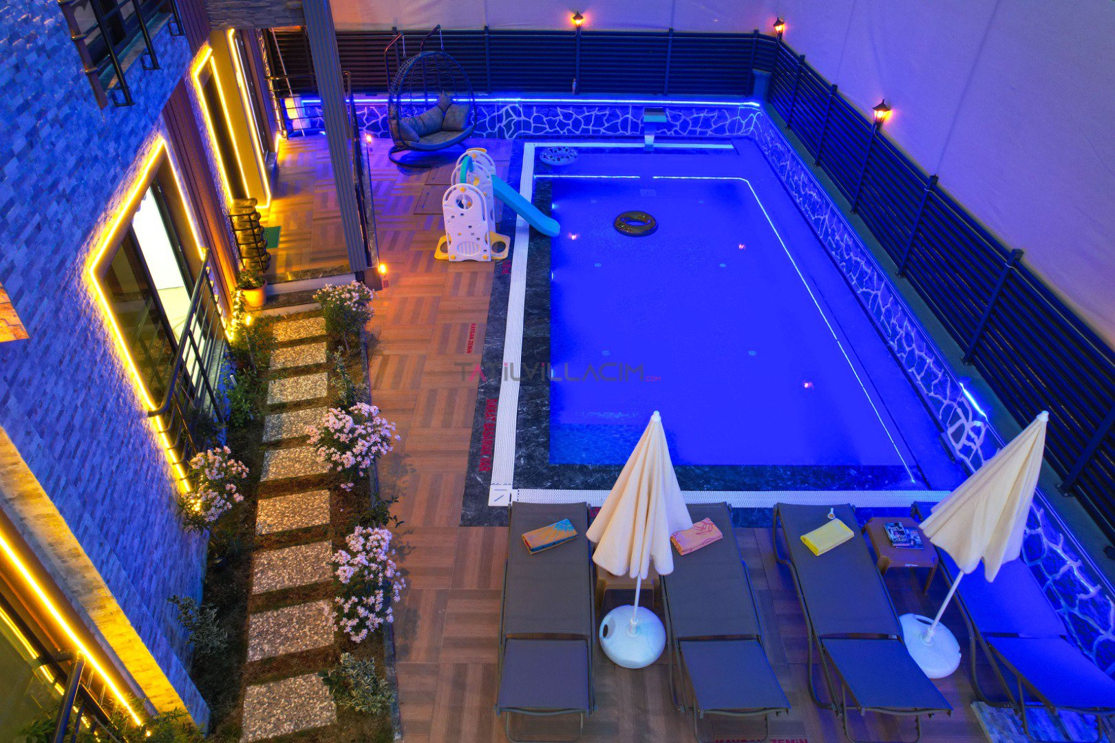 Havuz:Villamızın özel yüzme havuzu korunaklı şekilde tasarlanmış olup dışarıdan görünmeyecek şekilde mahremiyet sunar. Bu özelliğiyle özellikle muhafazakâr ailelerin ve balayı çiftlerinin de tercih sebebi olmuştur. Ayrıca villada özel otopark alanı da bulunmaktadır.