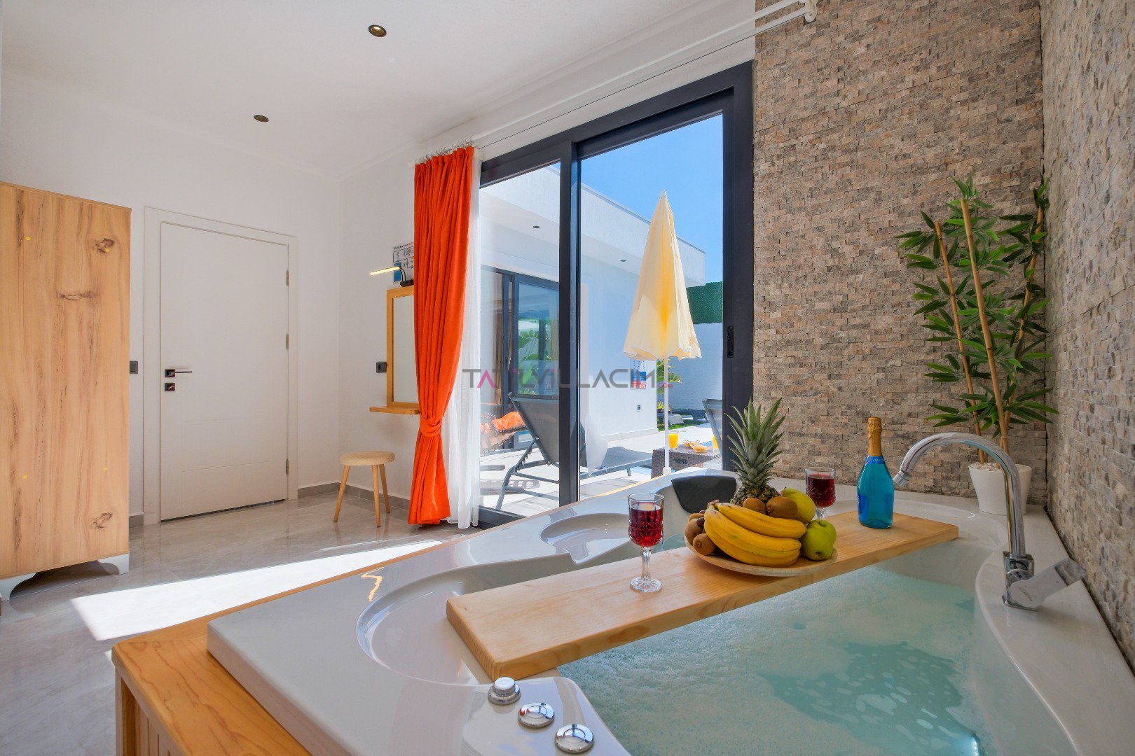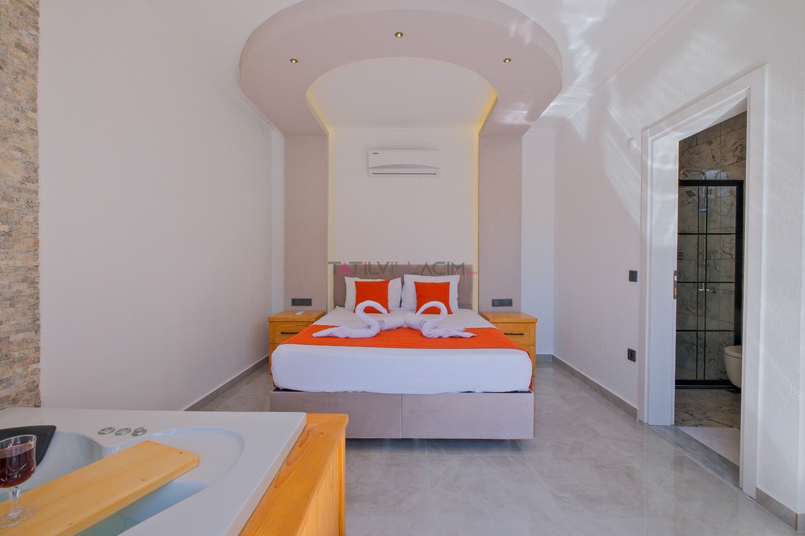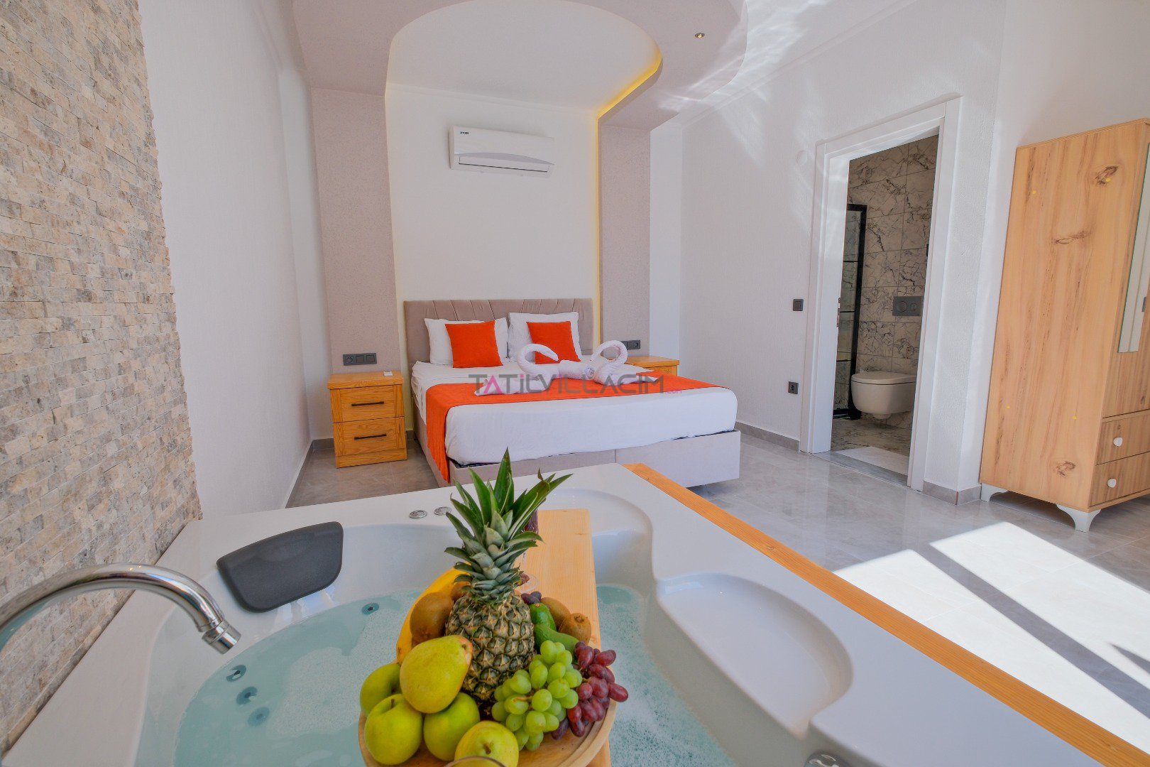 Villada yer alan jakuzili oda, tatilinize ekstra rahatlık ve lüks katarken, doğayla iç içe keyif dolu bir konaklama fırsatı sağlar.