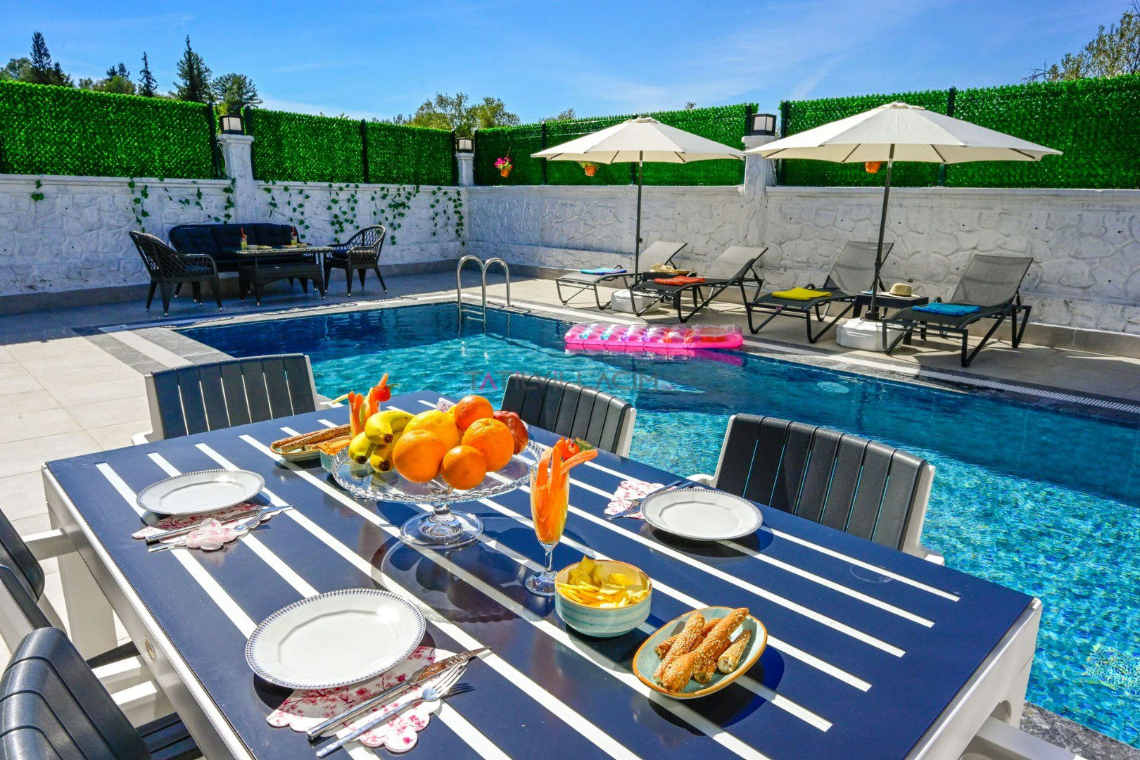 Günün en keyifli anları ise dış alanda sizi bekler. Özel yüzme havuzunda serinleyebilir, güneşlenme alanında dinlenebilir, akşam saatlerinde barbekü alanında sevdiklerinizle uzun sofralar kurabilirsiniz. Havuz alanı korunaksız olup dışarıdan görünme ihtimali bulunmaktadır.