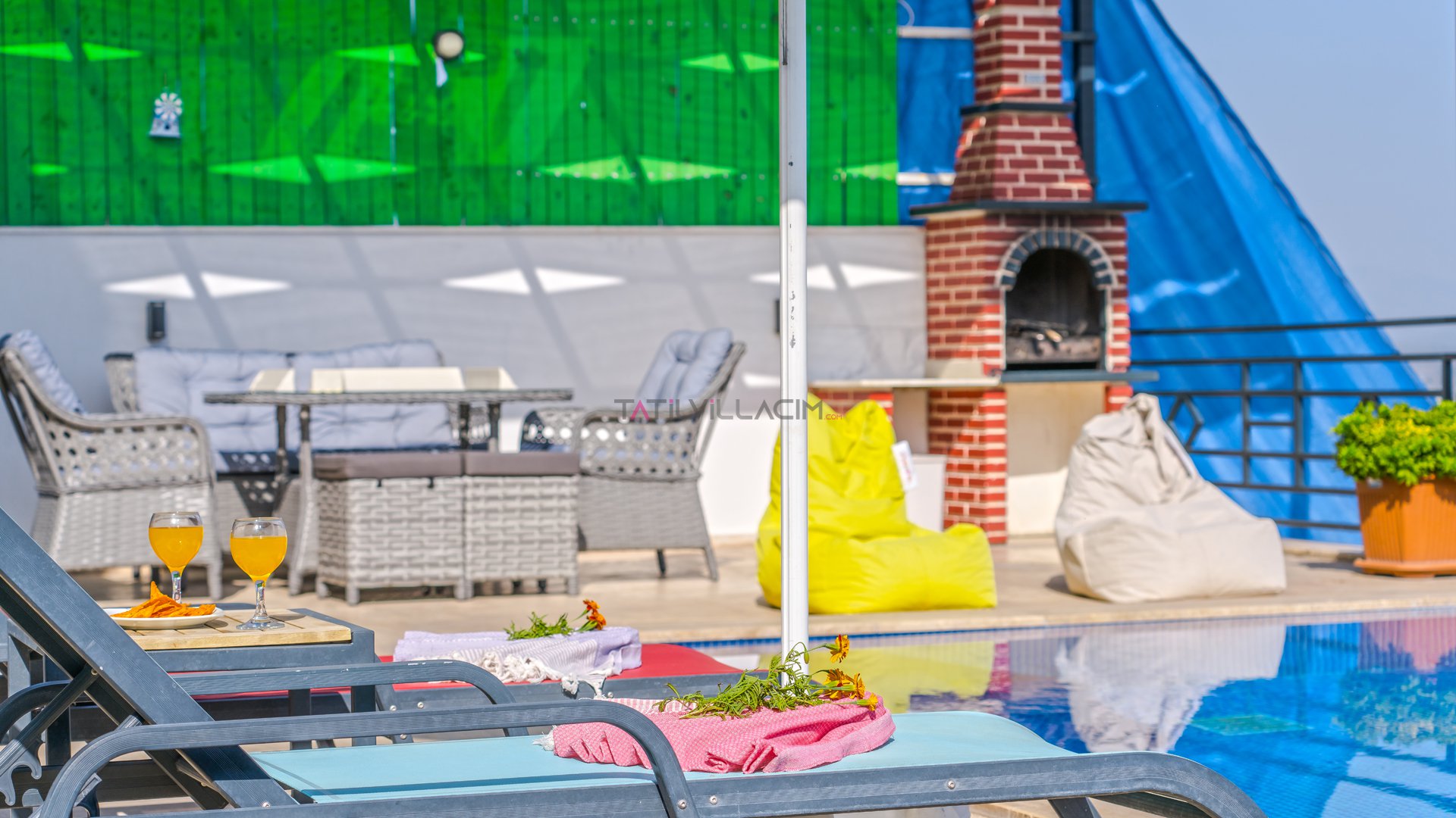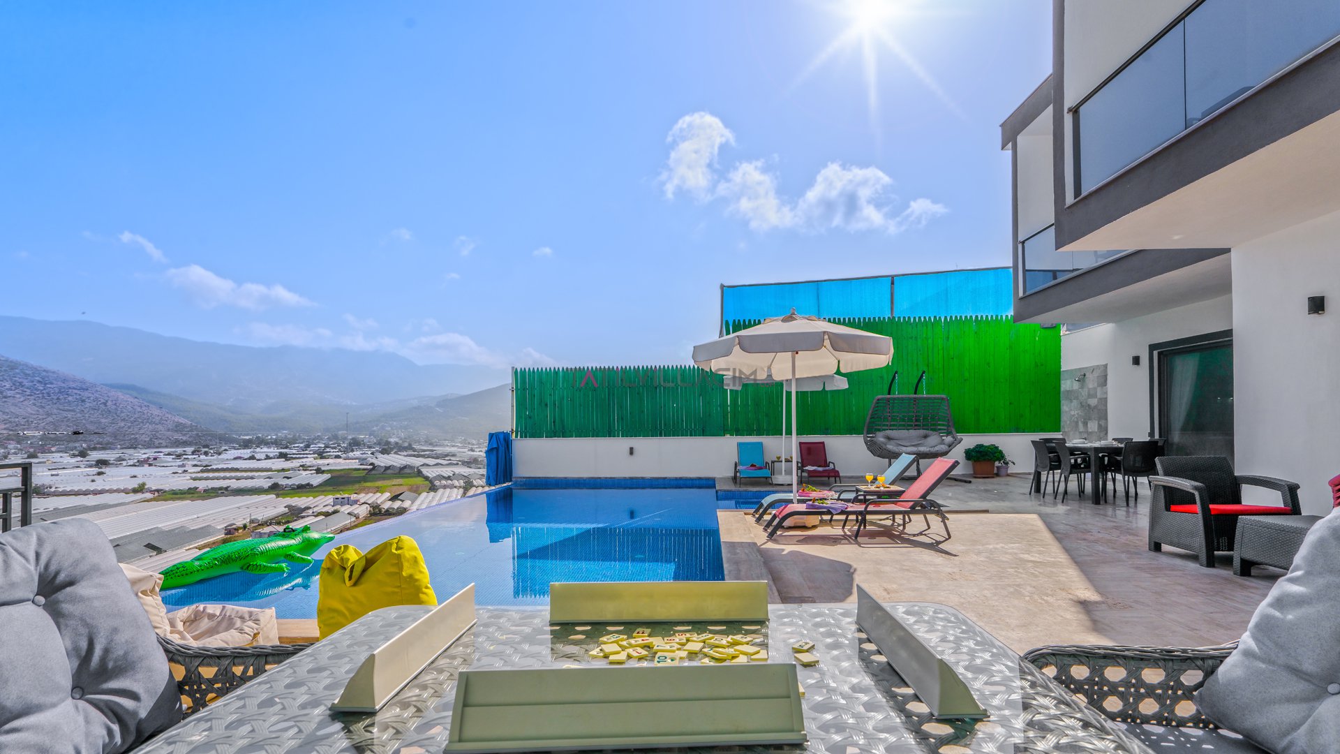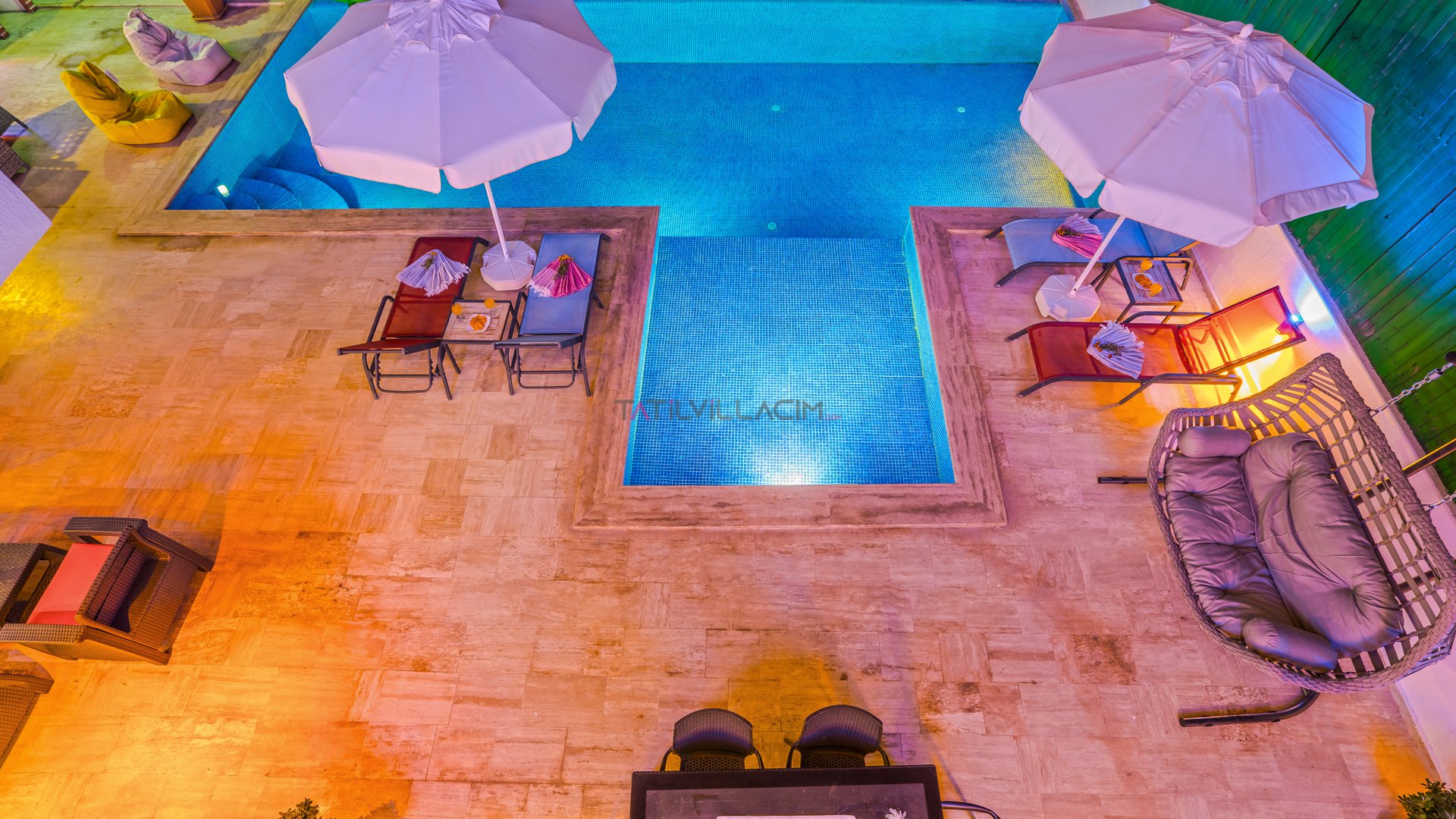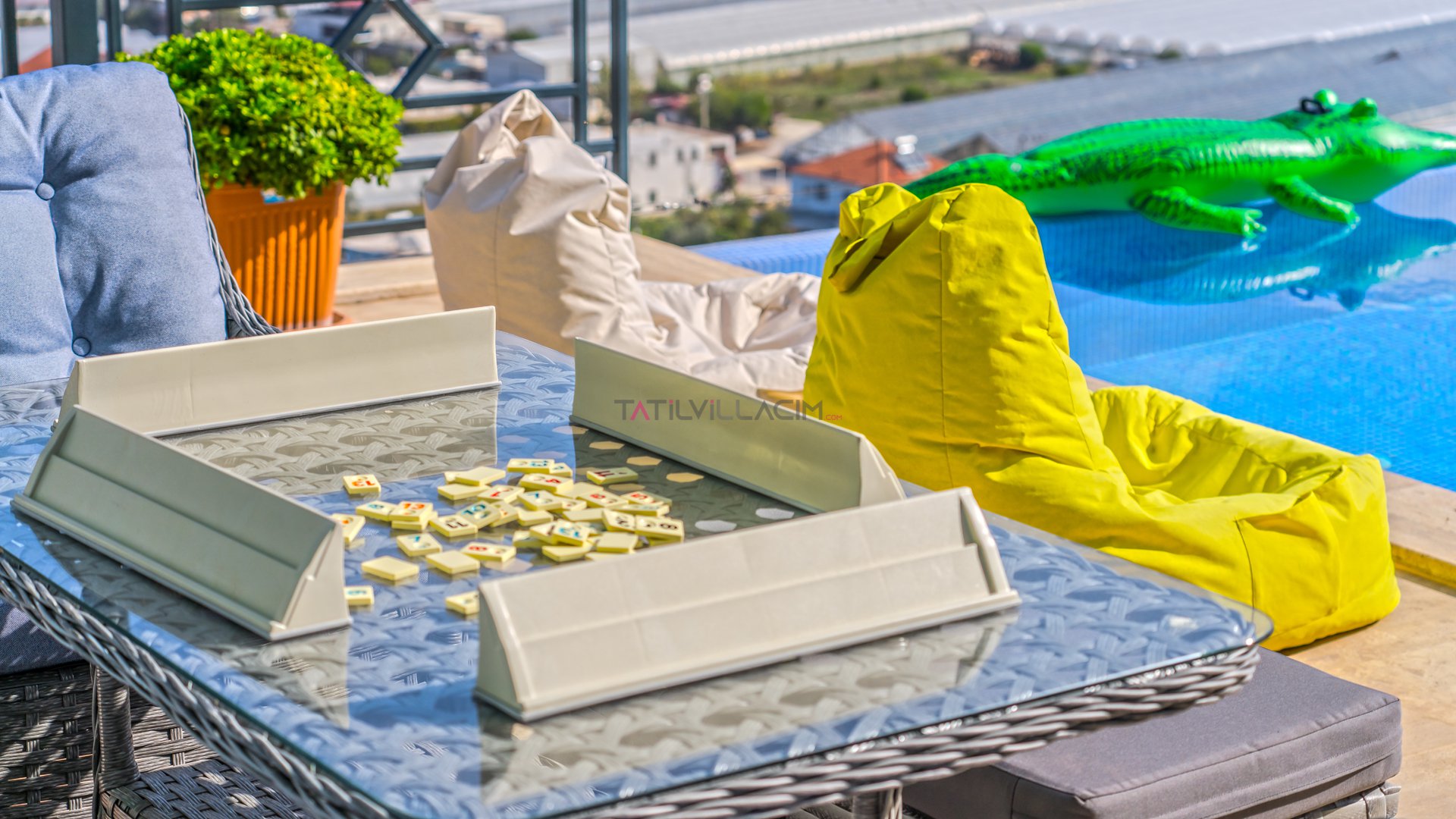 Korunaklı havuz alanına sahip olan villamızın havuz terasında bahçe salıncağı, langırt ve oturma alanı bulunuyor.