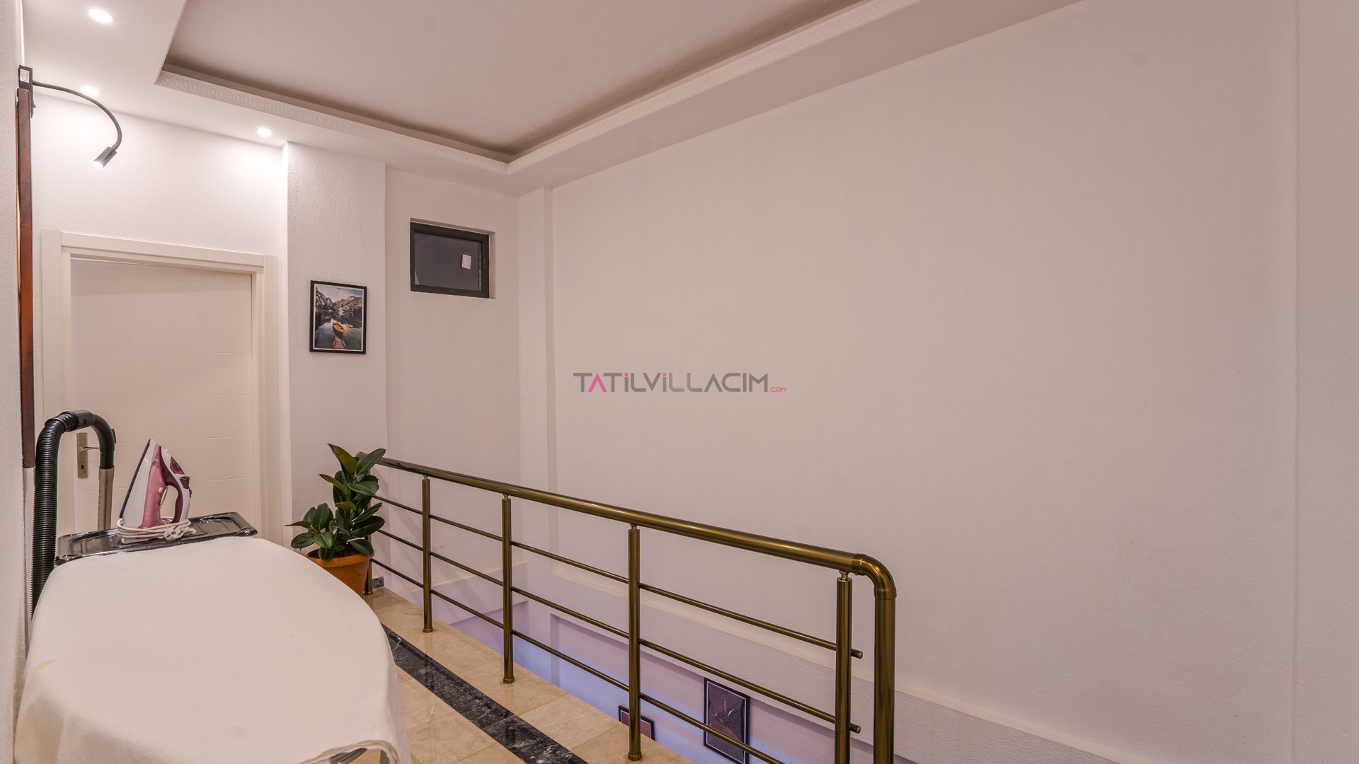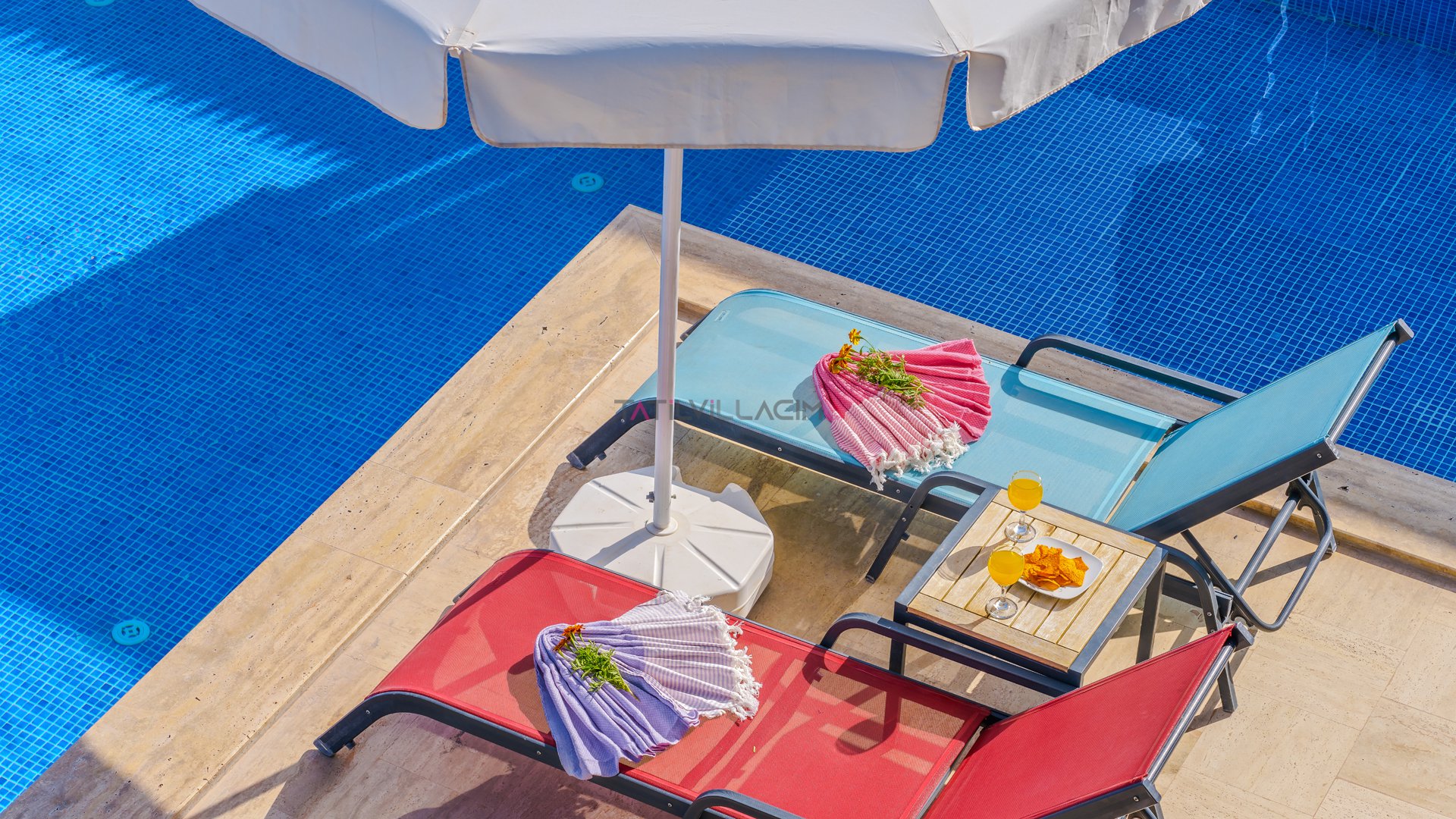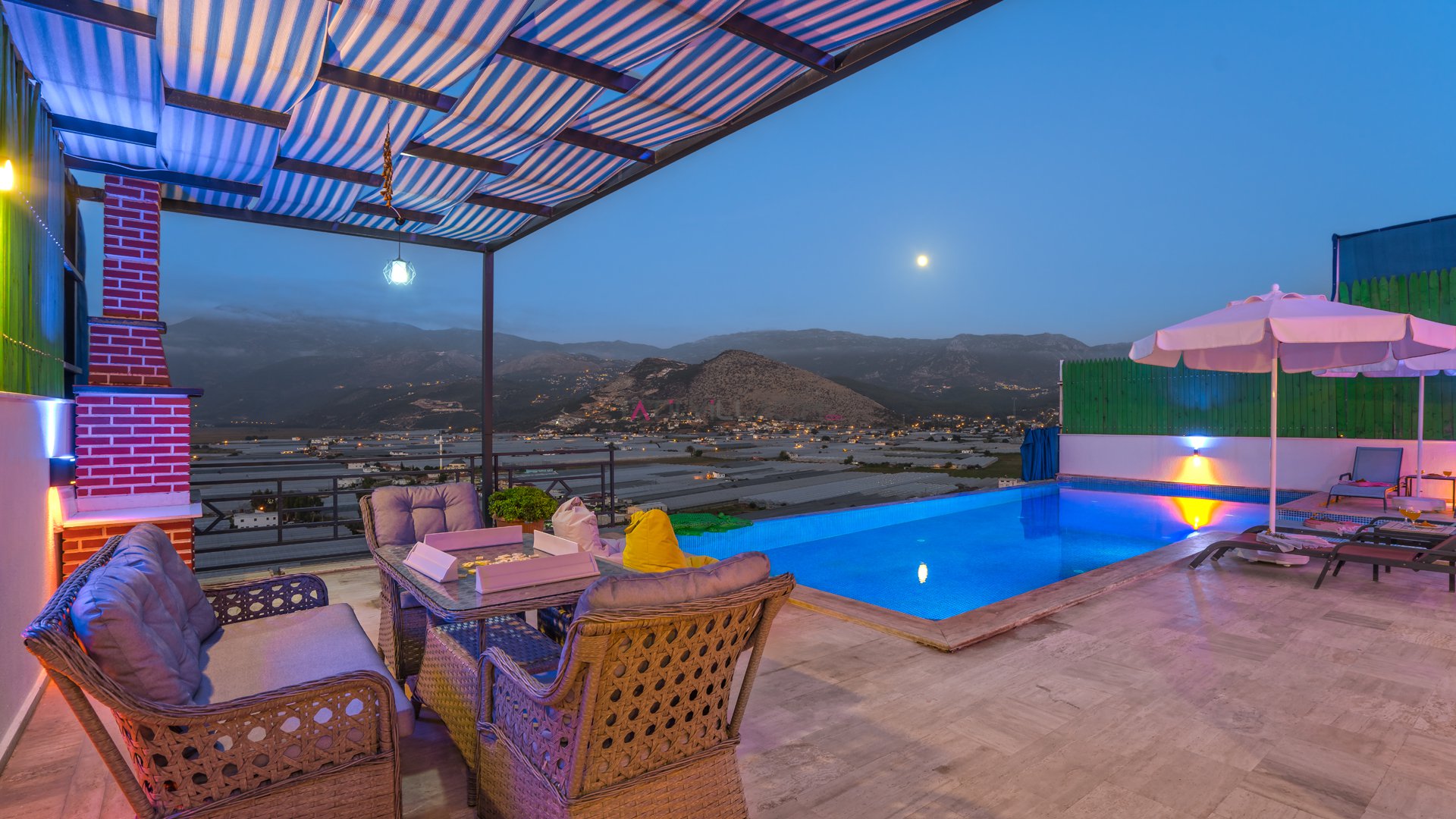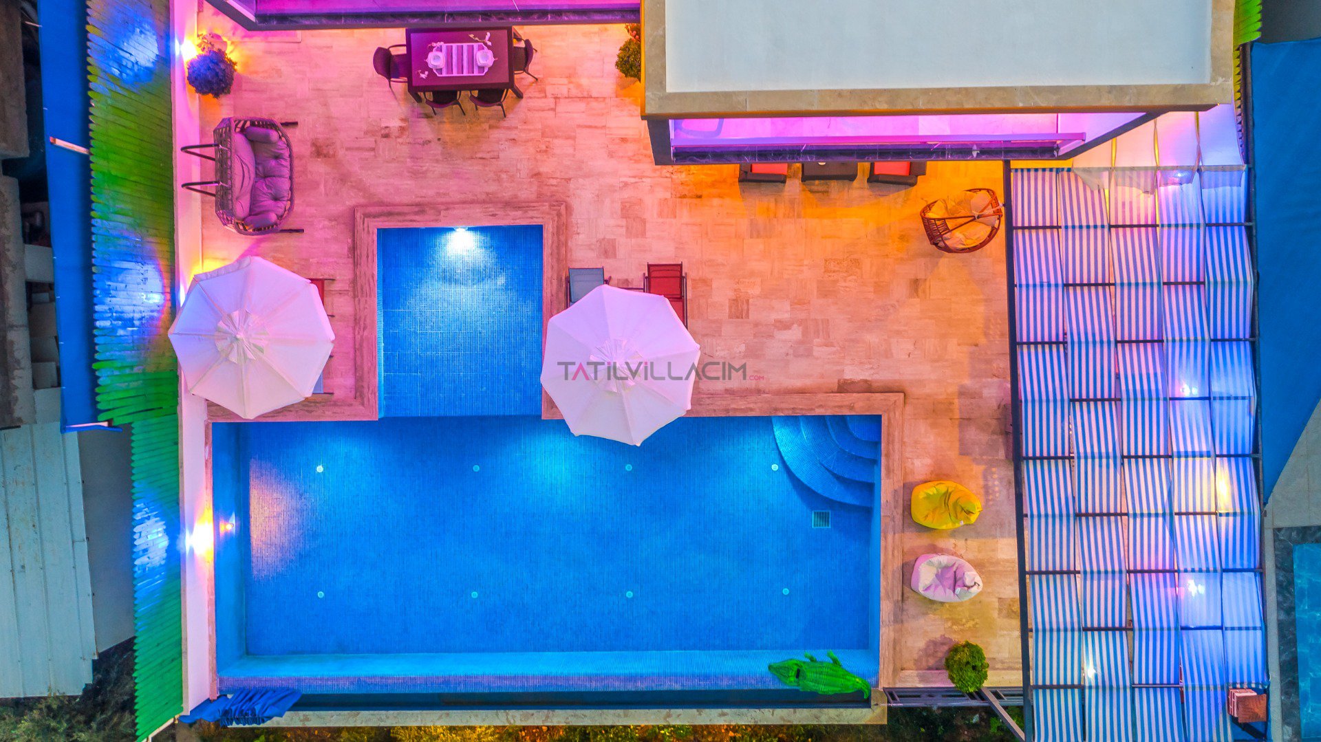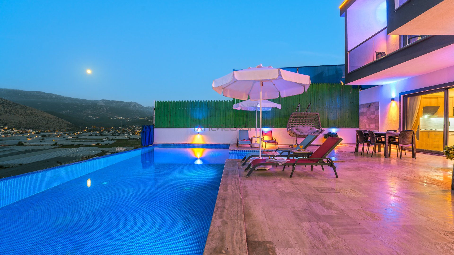 Korunaklı havuz alanına sahip olan villamızın havuz terasında bahçe salıncağı, langırt ve oturma alanı bulunuyor.