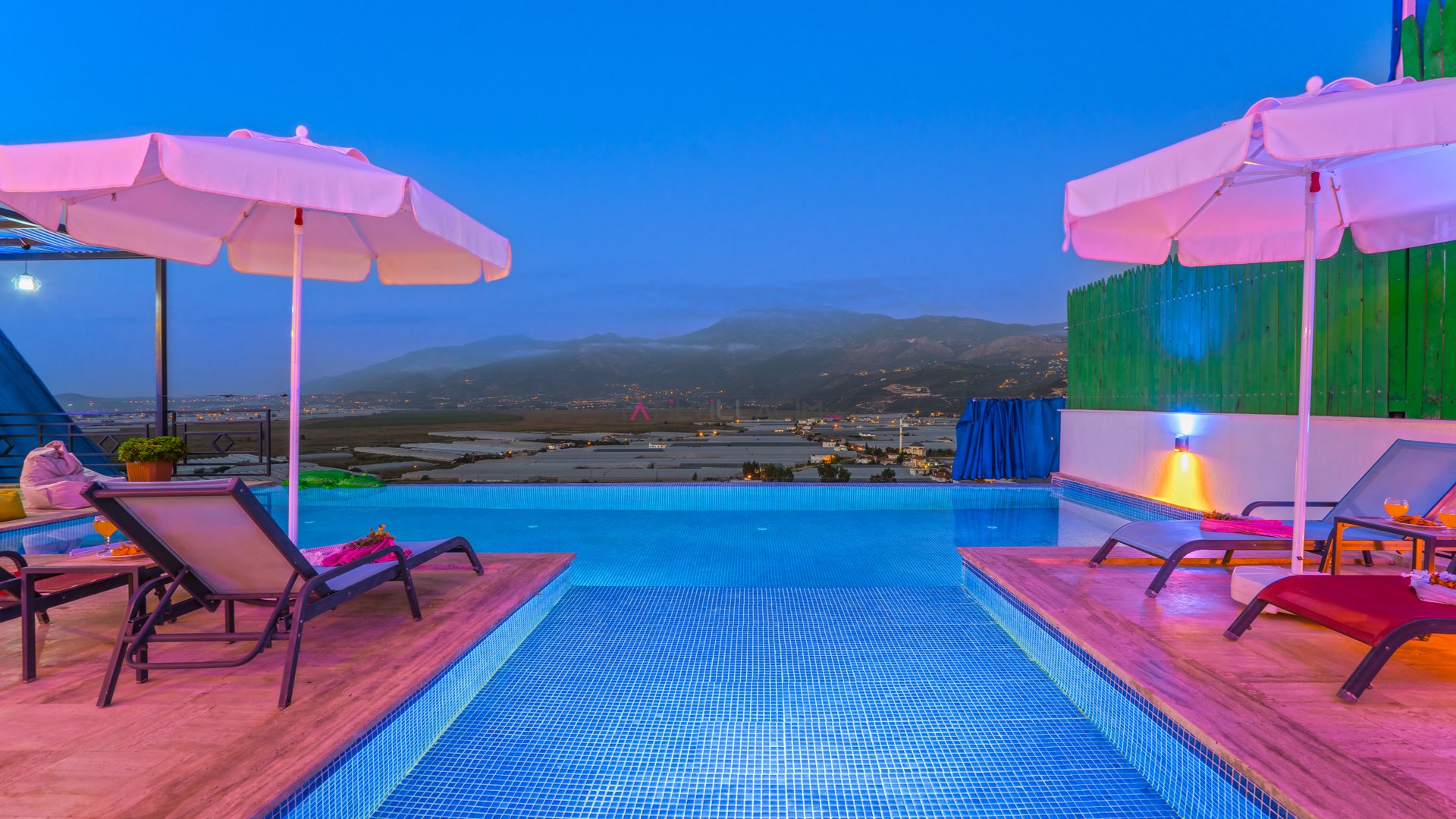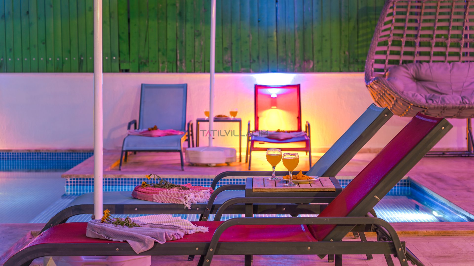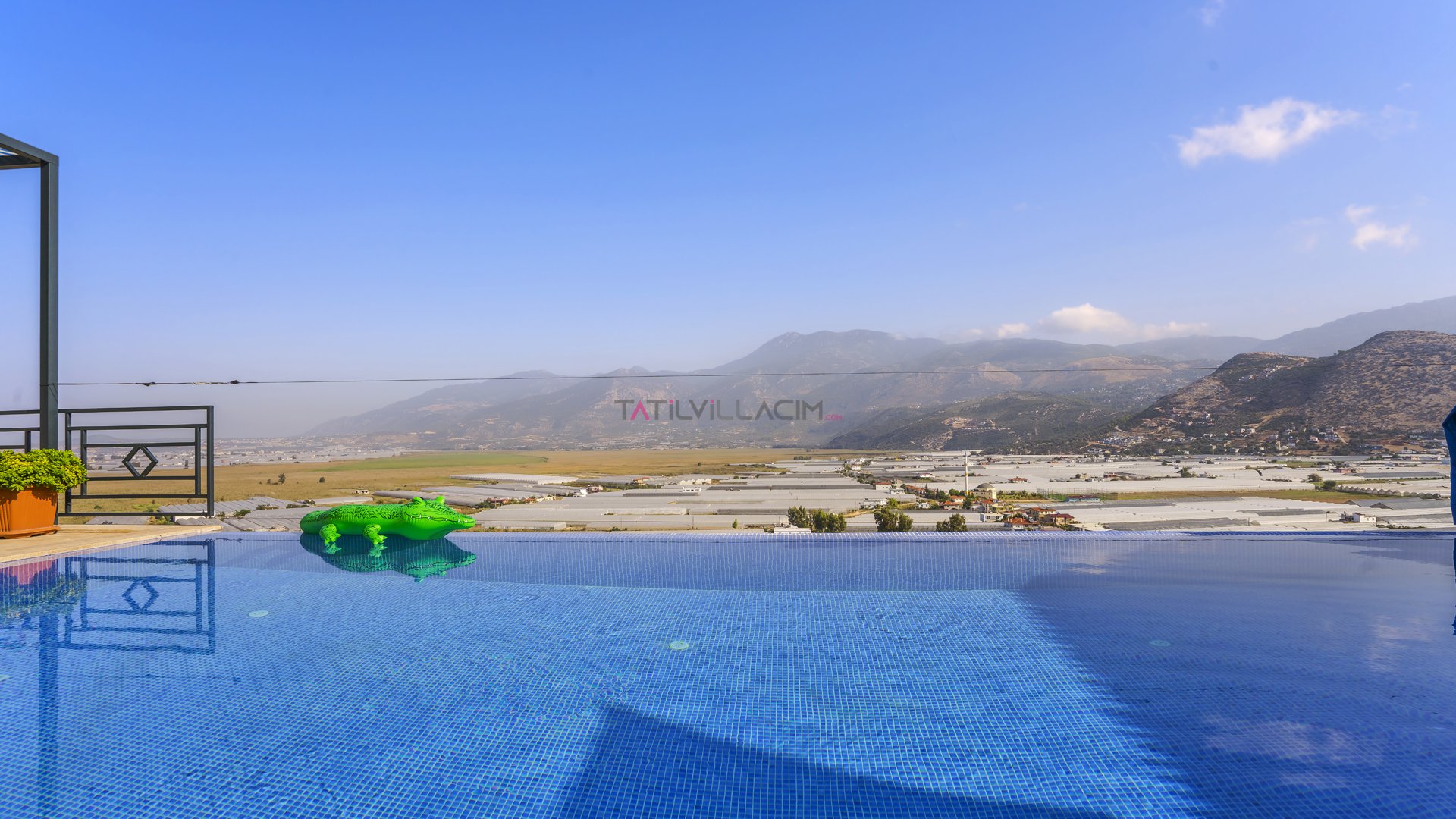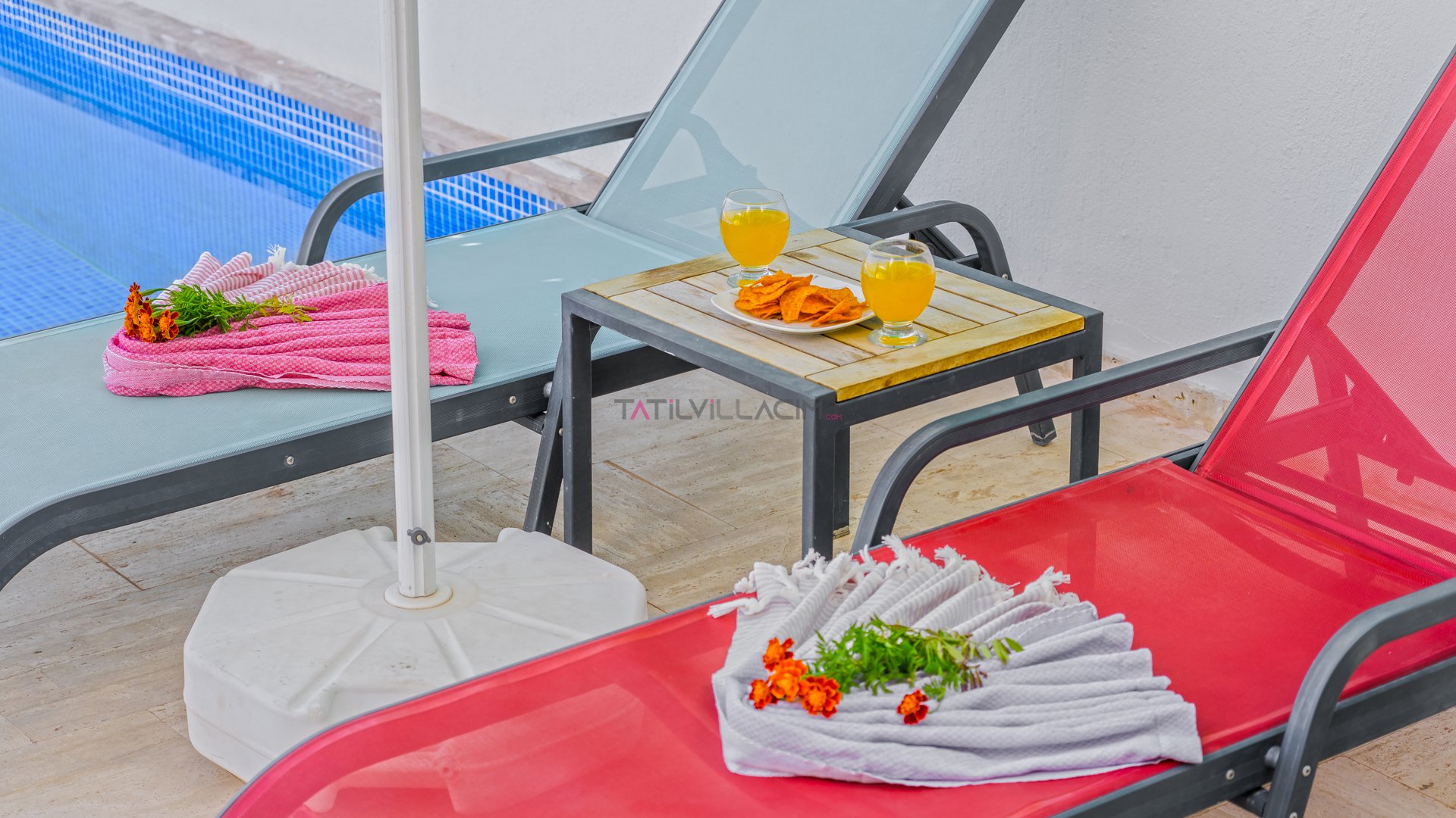 Korunaklı havuz alanına sahip olan villamızın havuz terasında bahçe salıncağı, langırt ve oturma alanı bulunuyor.