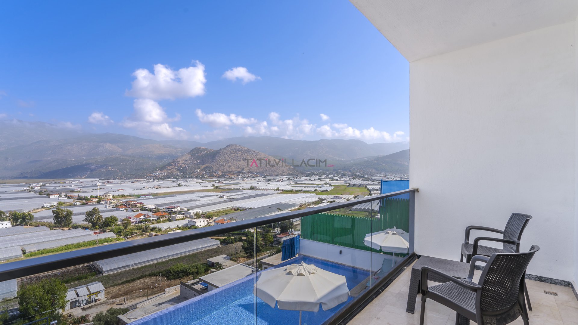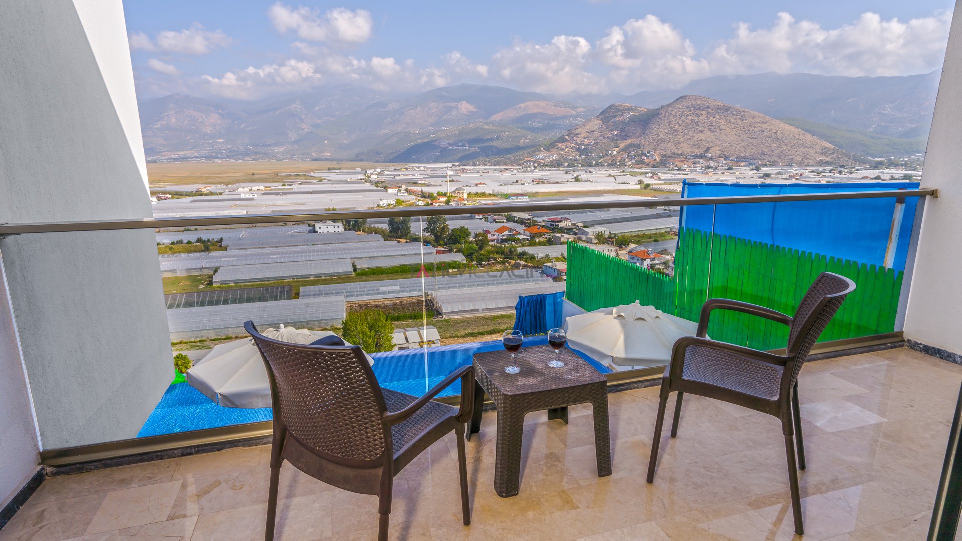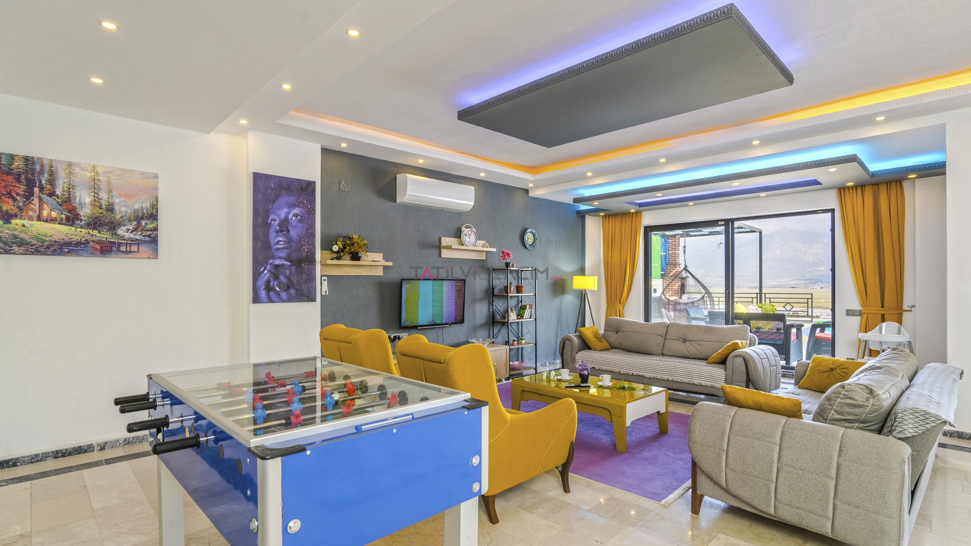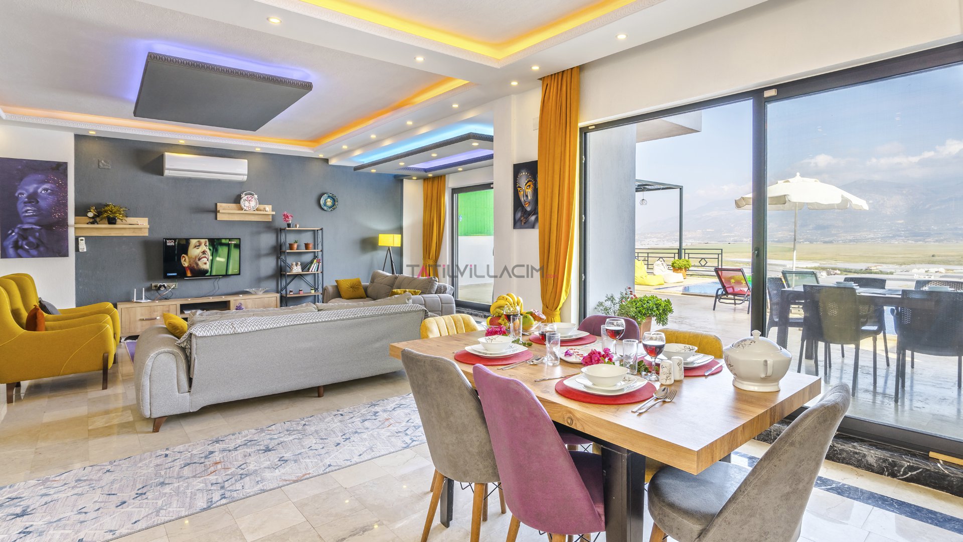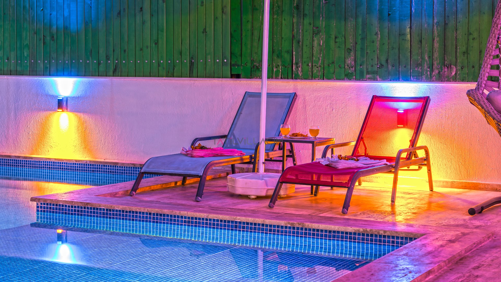 Korunaklı havuz alanına sahip olan villamızın havuz terasında bahçe salıncağı, langırt ve oturma alanı bulunuyor.