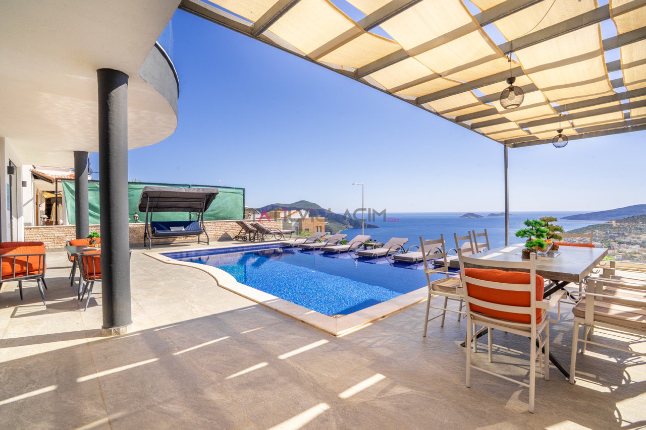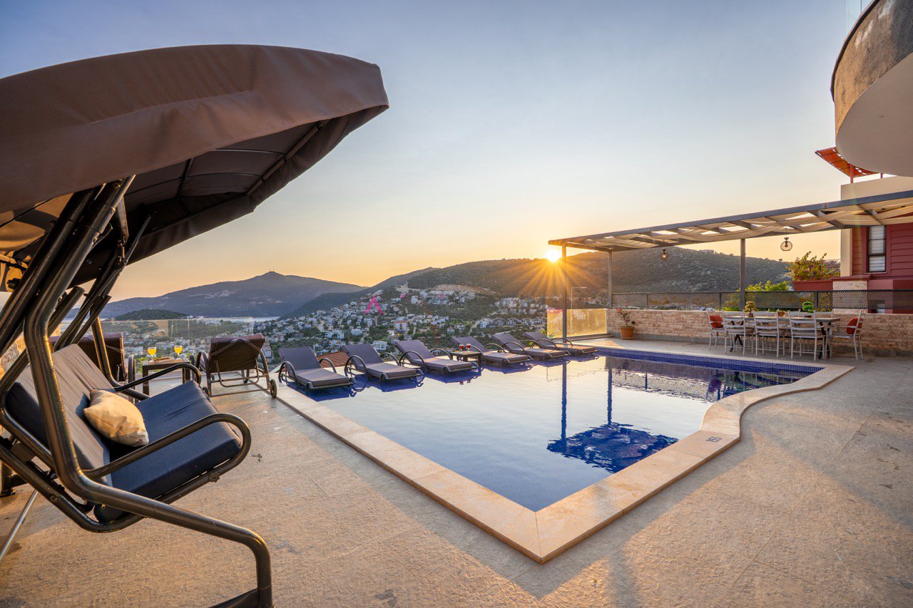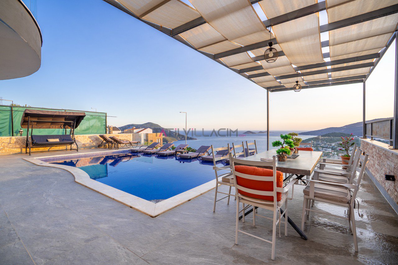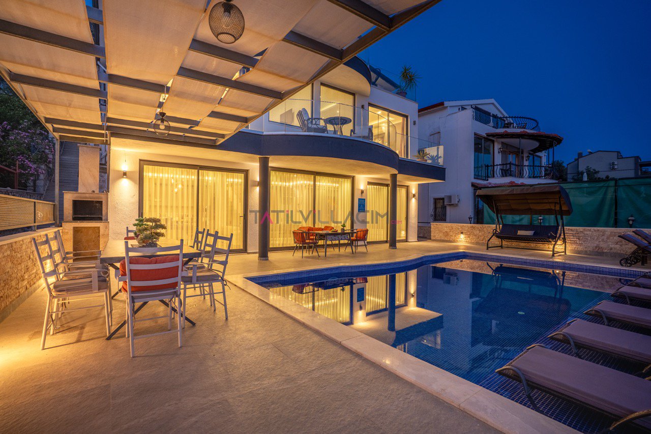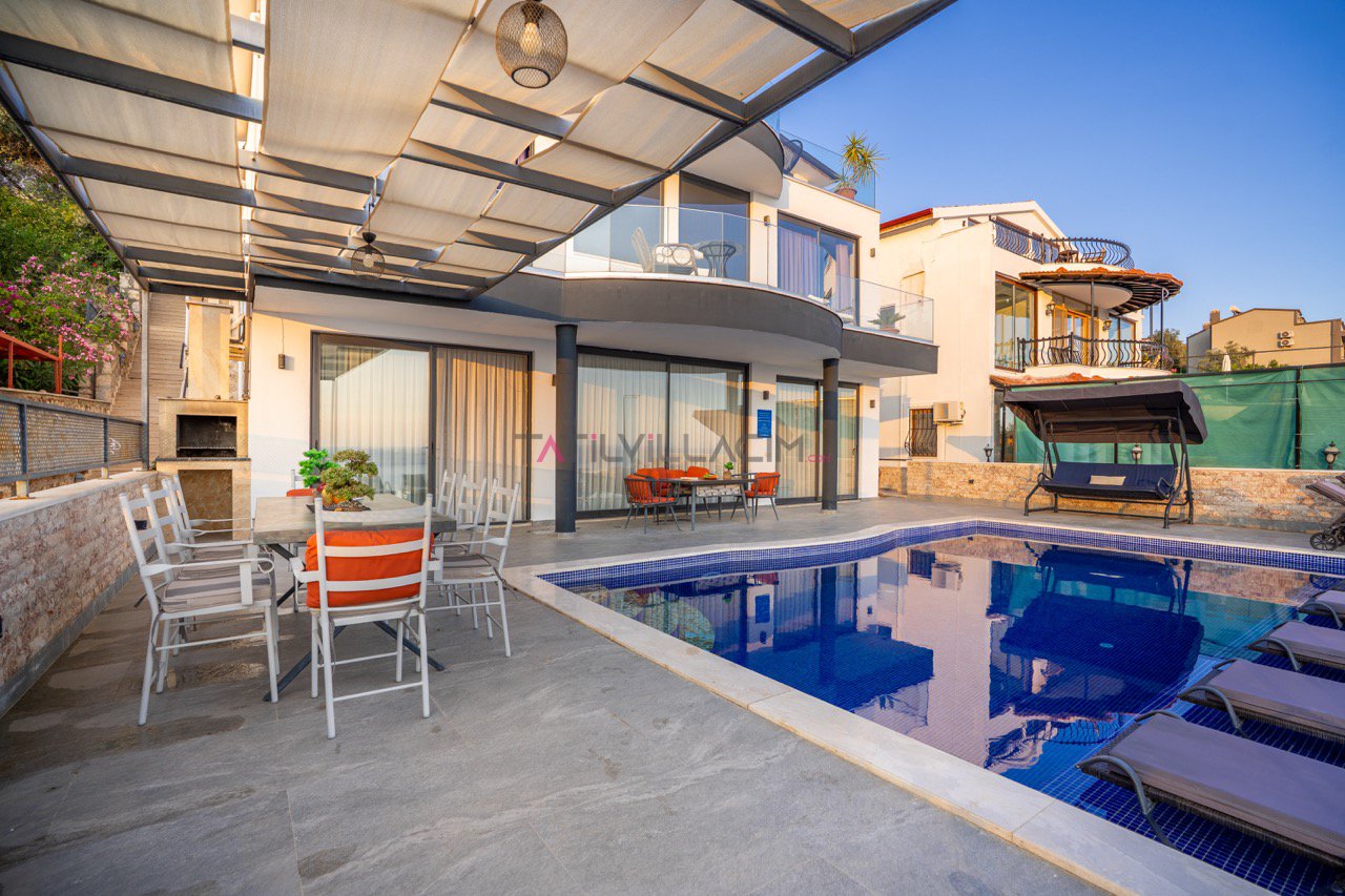Kalkan'ın eşsiz maviliğini sunan geniş havuz terasında oturma alanı, bahçe salıncağı ve barbekü bulunuyor.