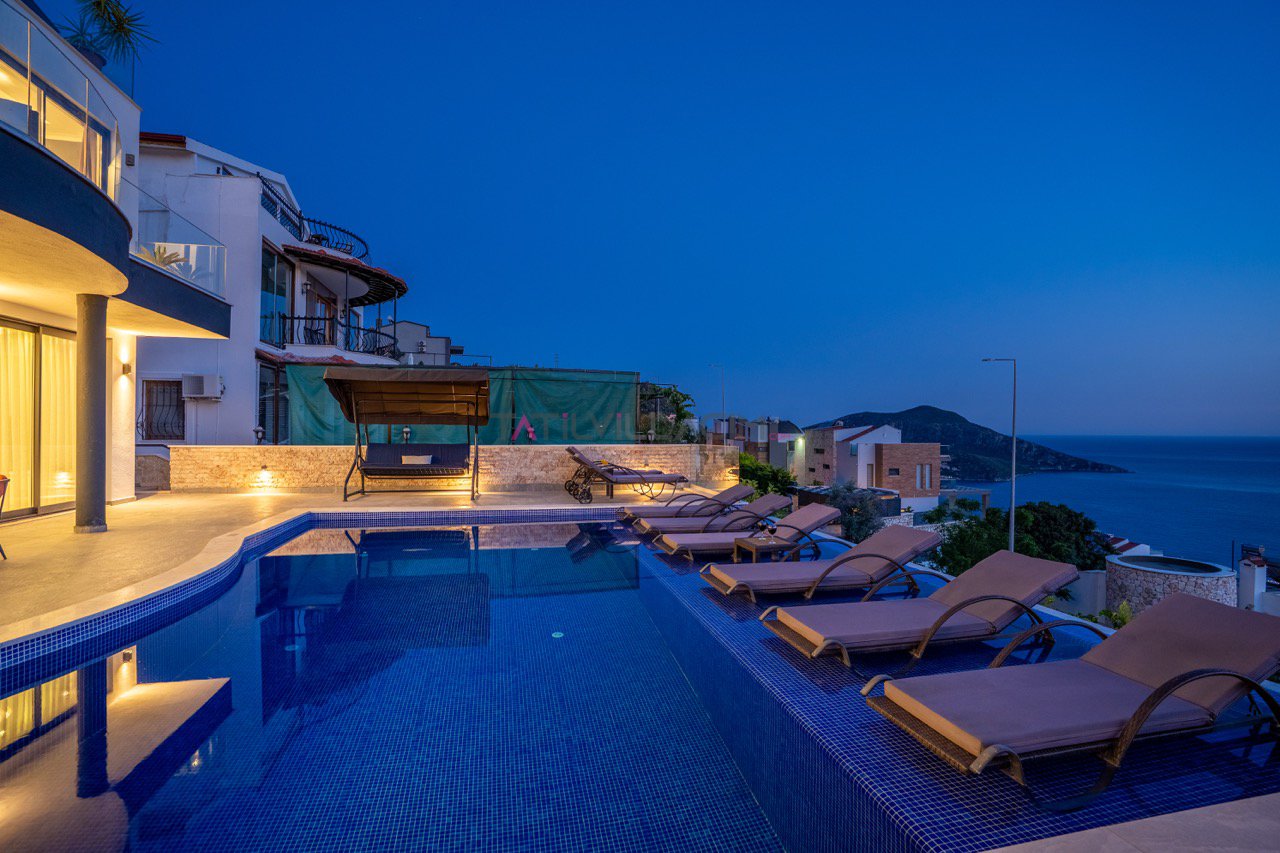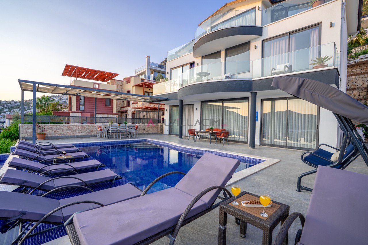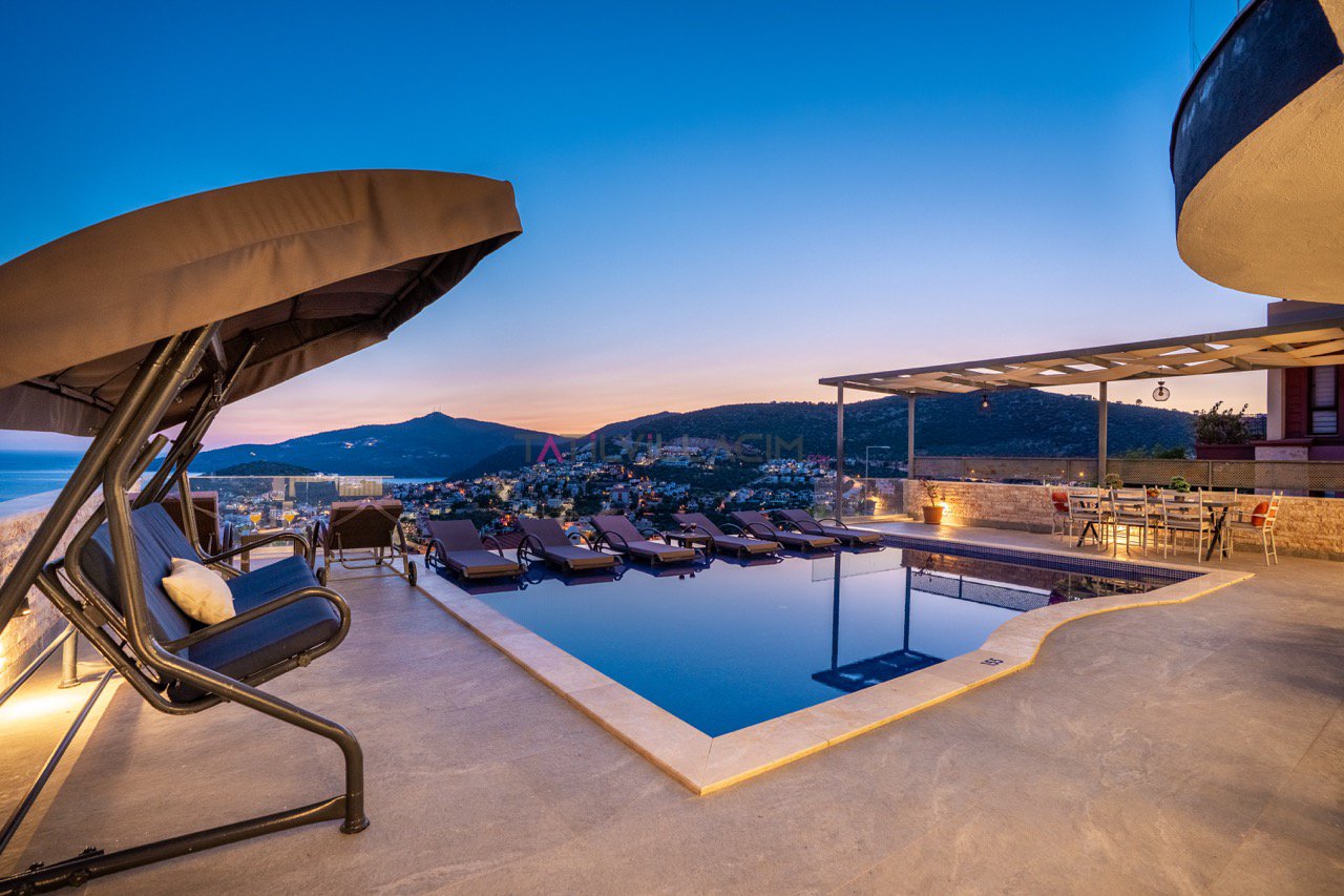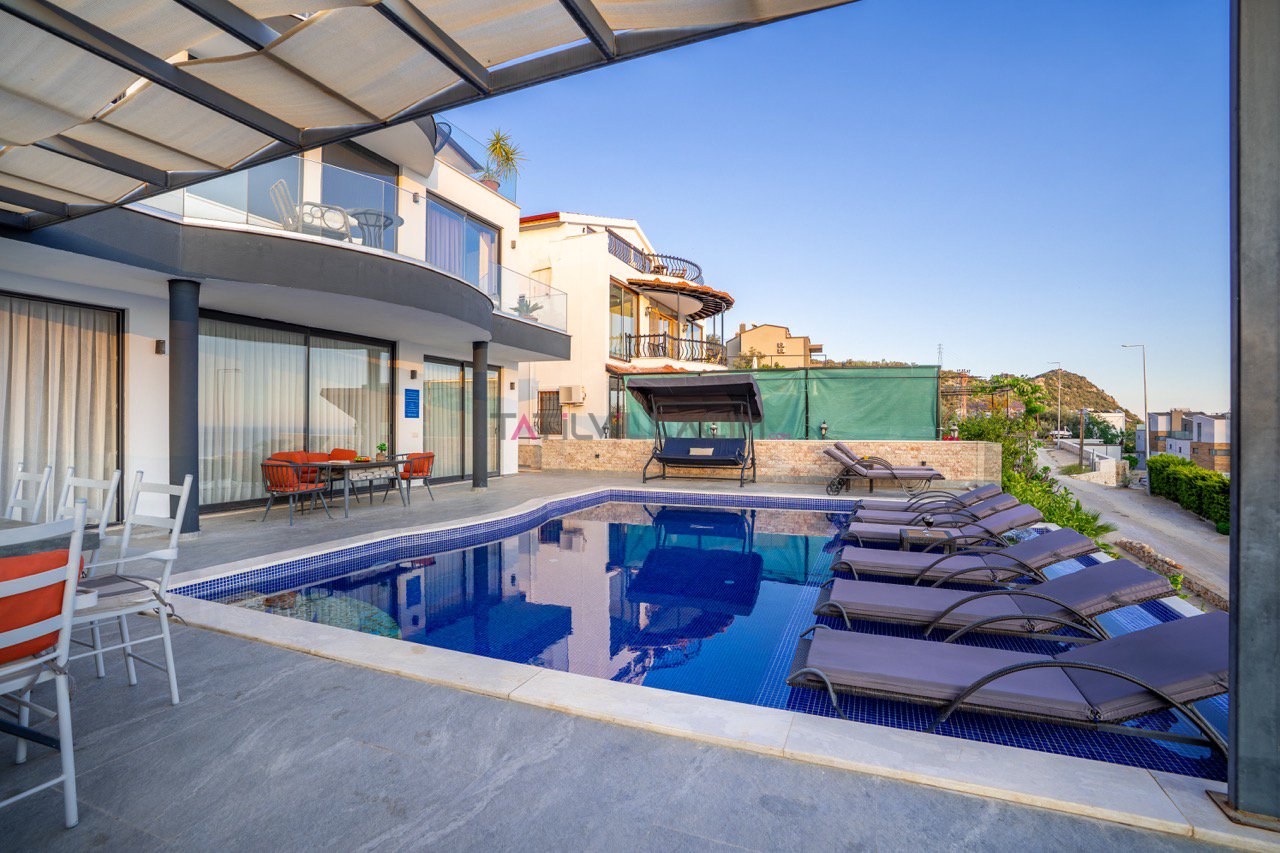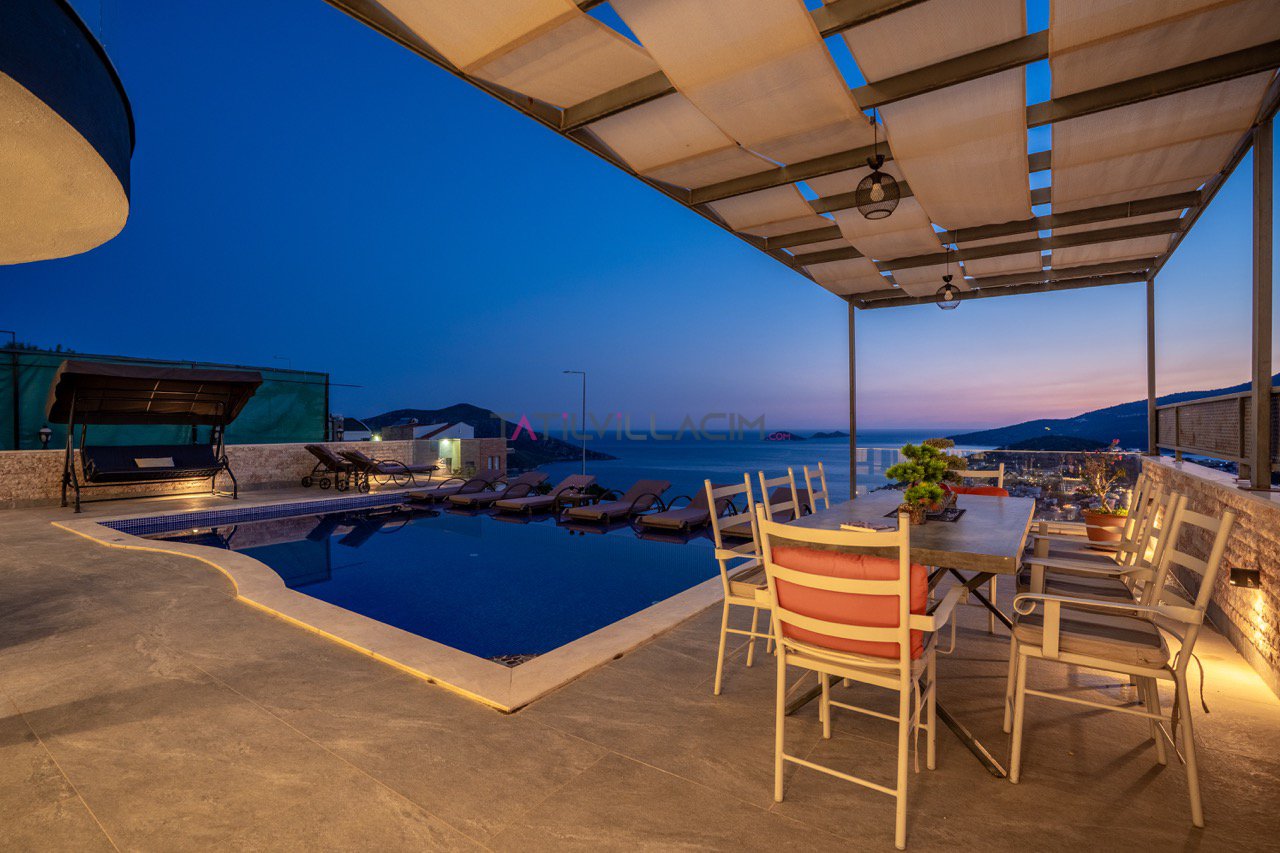 Kalkan'ın eşsiz maviliğini sunan geniş havuz terasında oturma alanı, bahçe salıncağı ve barbekü bulunuyor.