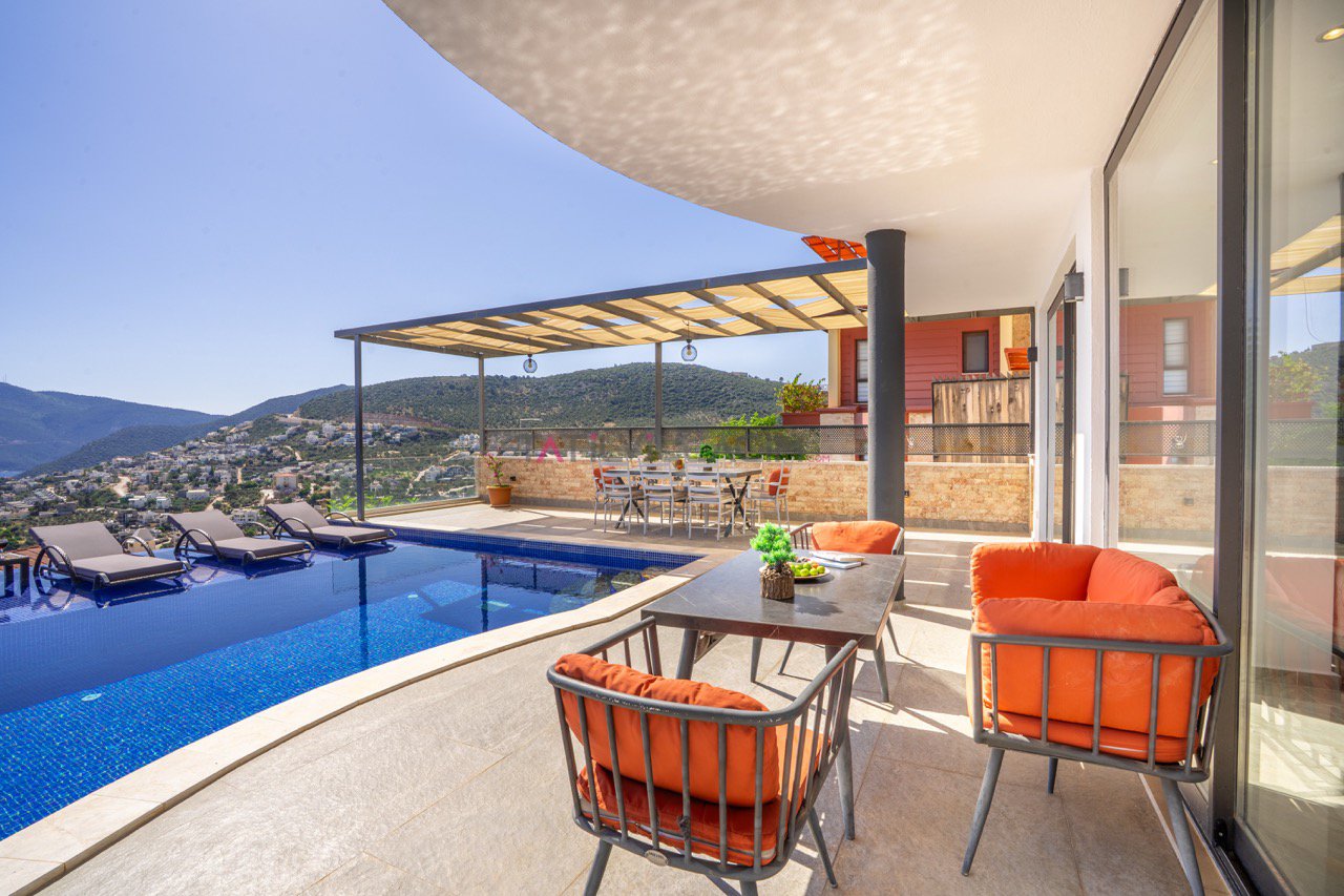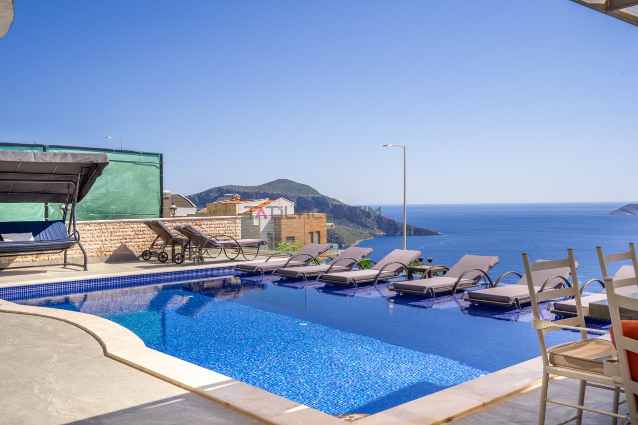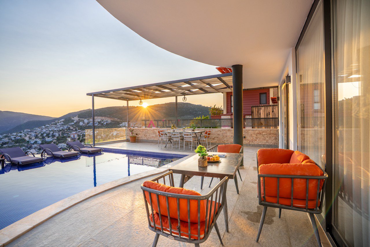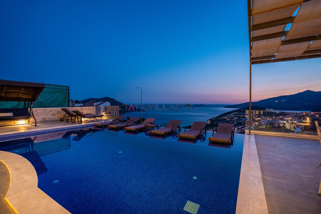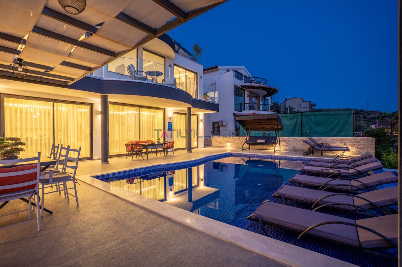 Kalkan'ın eşsiz maviliğini sunan geniş havuz terasında oturma alanı, bahçe salıncağı ve barbekü bulunuyor.