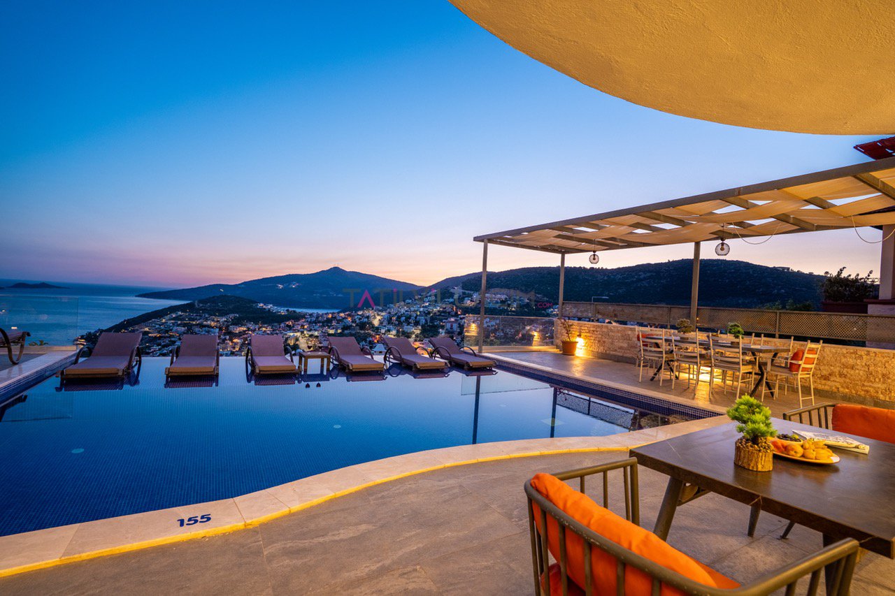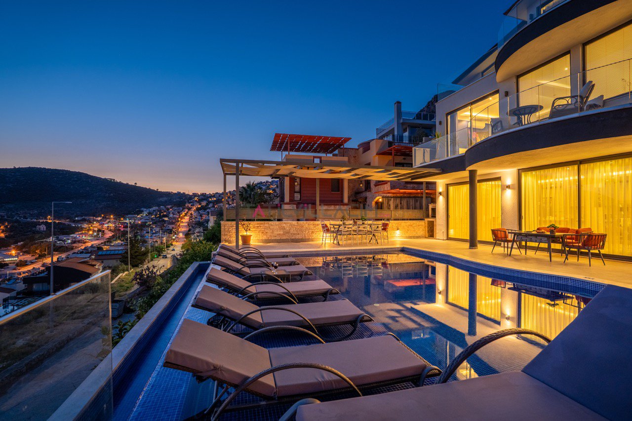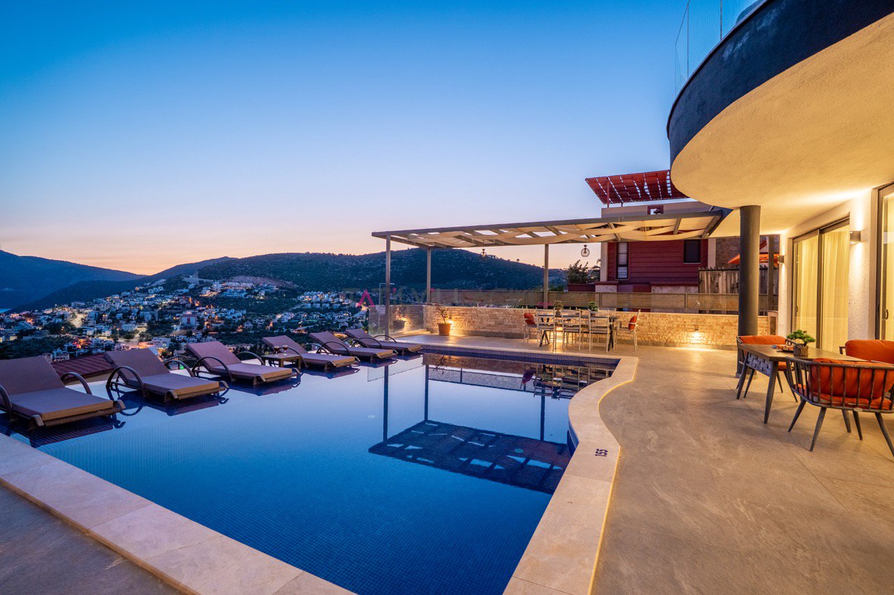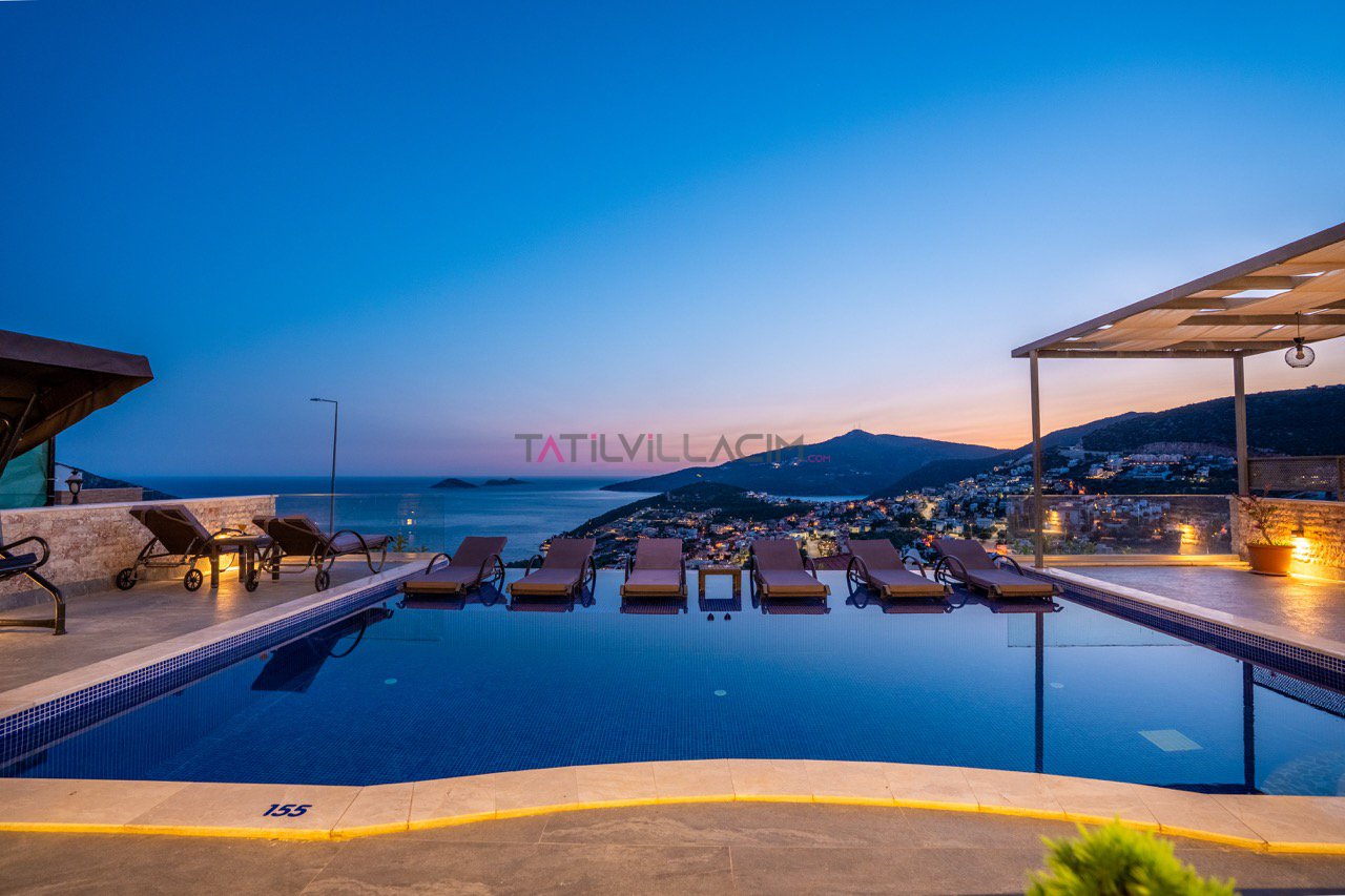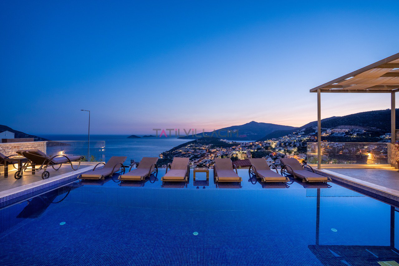 Kalkan'ın eşsiz maviliğini sunan geniş havuz terasında oturma alanı, bahçe salıncağı ve barbekü bulunuyor.