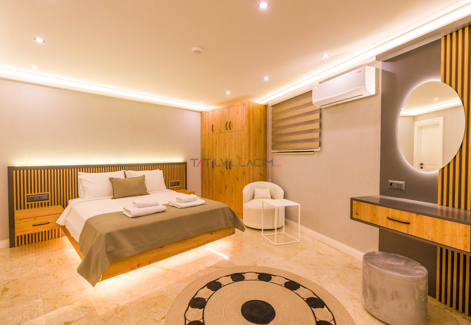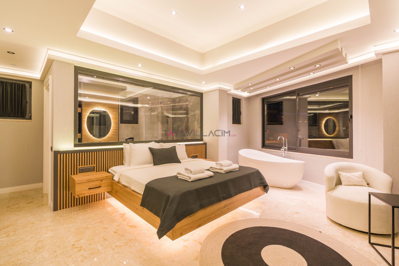Yatak odaları konforlu bir uyku deneyimi için tasarlanmış olup, 2 çift kişilik yatak ve 2 tek kişilik yatak mevcuttur. Özellikle alt katta kapalı havuzun yanında bulunan çift kişilik yatak odası, özel bir konfor sunar. Villa Moonset, modern mimarisi ve muhteşem deniz manzarası ile Kalkan’ın doğal güzelliklerini keşfetmek isteyenler için cazip bir seçenektir. Dinlenmek veya aktif bir tatil geçirmek isteyen misafirler için ideal bir tercihtir.