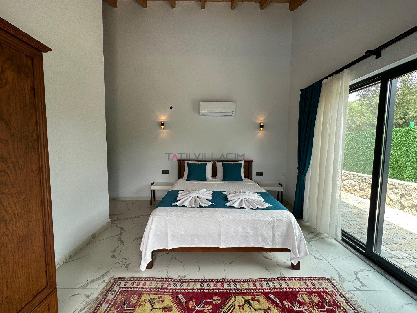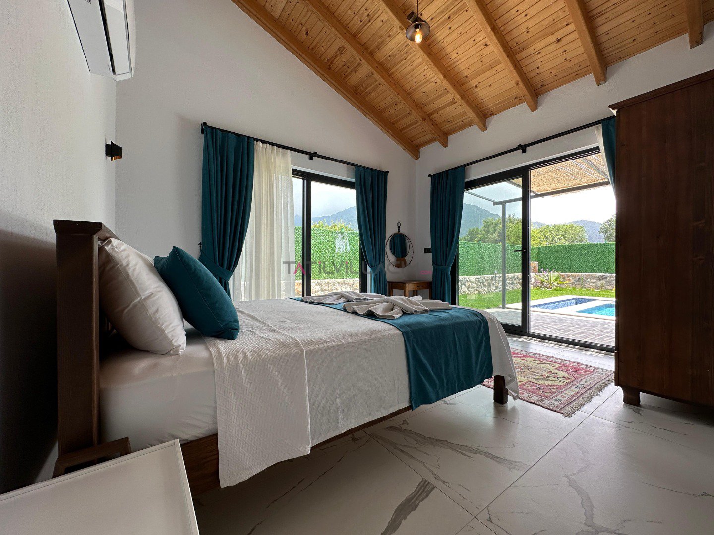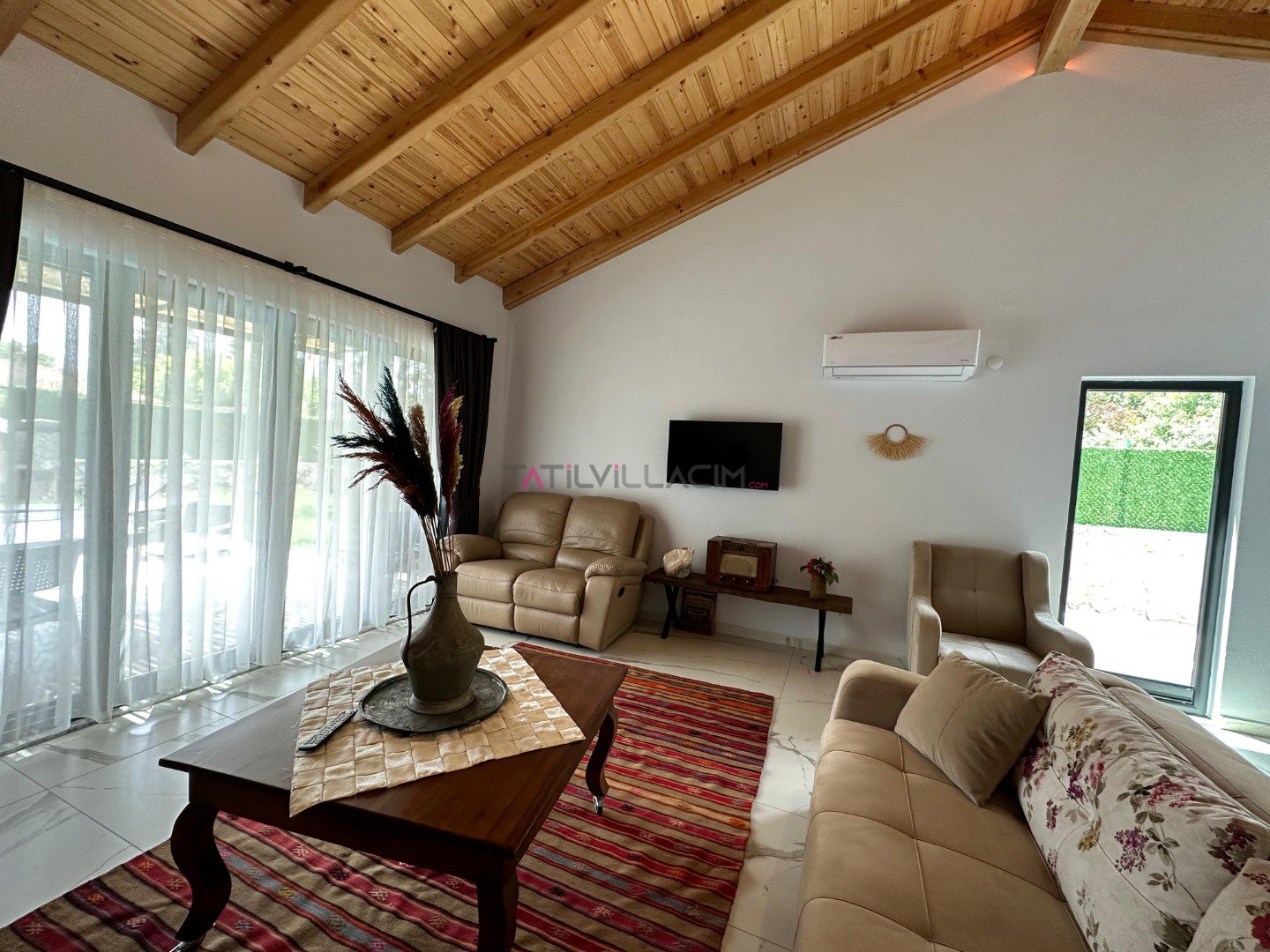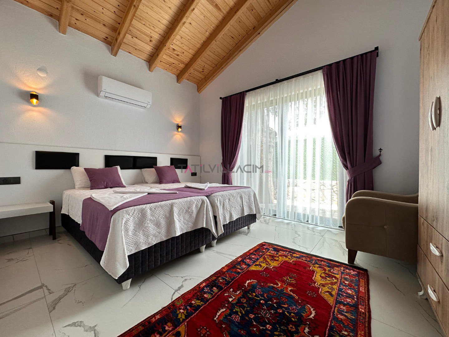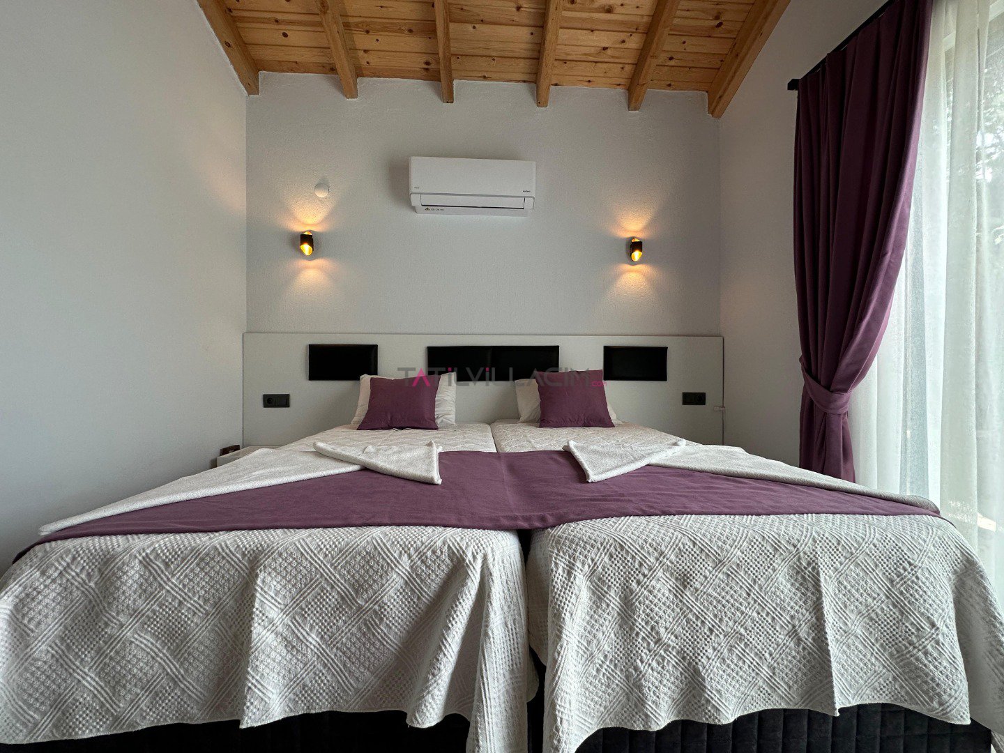 Villamızda 2 yatak odası bulunmaktadır. Ana yatak odasında çift kişilik yatak, ebeveyn banyosu ve klima; diğer yatak odasında ise iki tek kişilik yatak, ebeveyn banyosu ve klima yer almaktadır. Geniş ve ferah açık plan salon ve mutfak, tam donanımlı bir tatil imkanı sunmaktadır. Oturma grubu, klima ve TV ile donatılmış salon, misafirlerimize ev konforu sağlamaktadır.