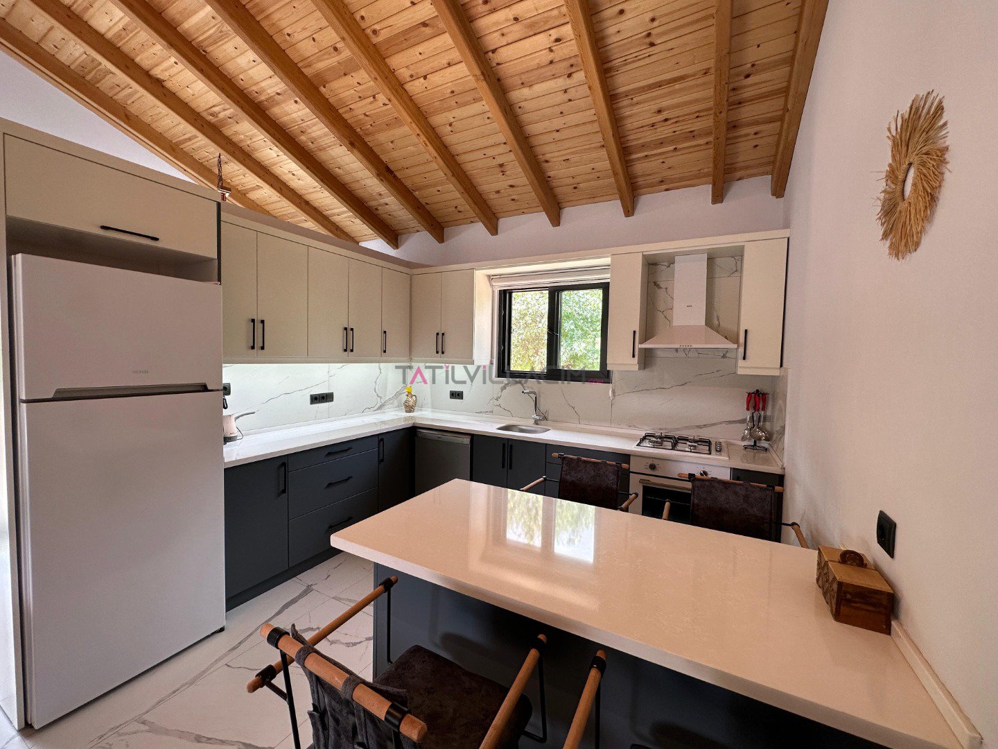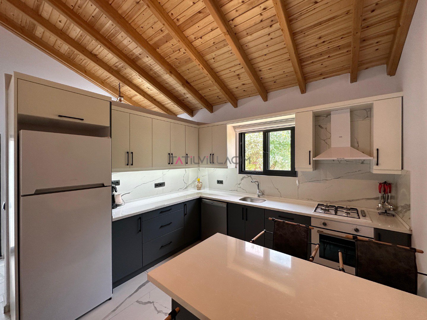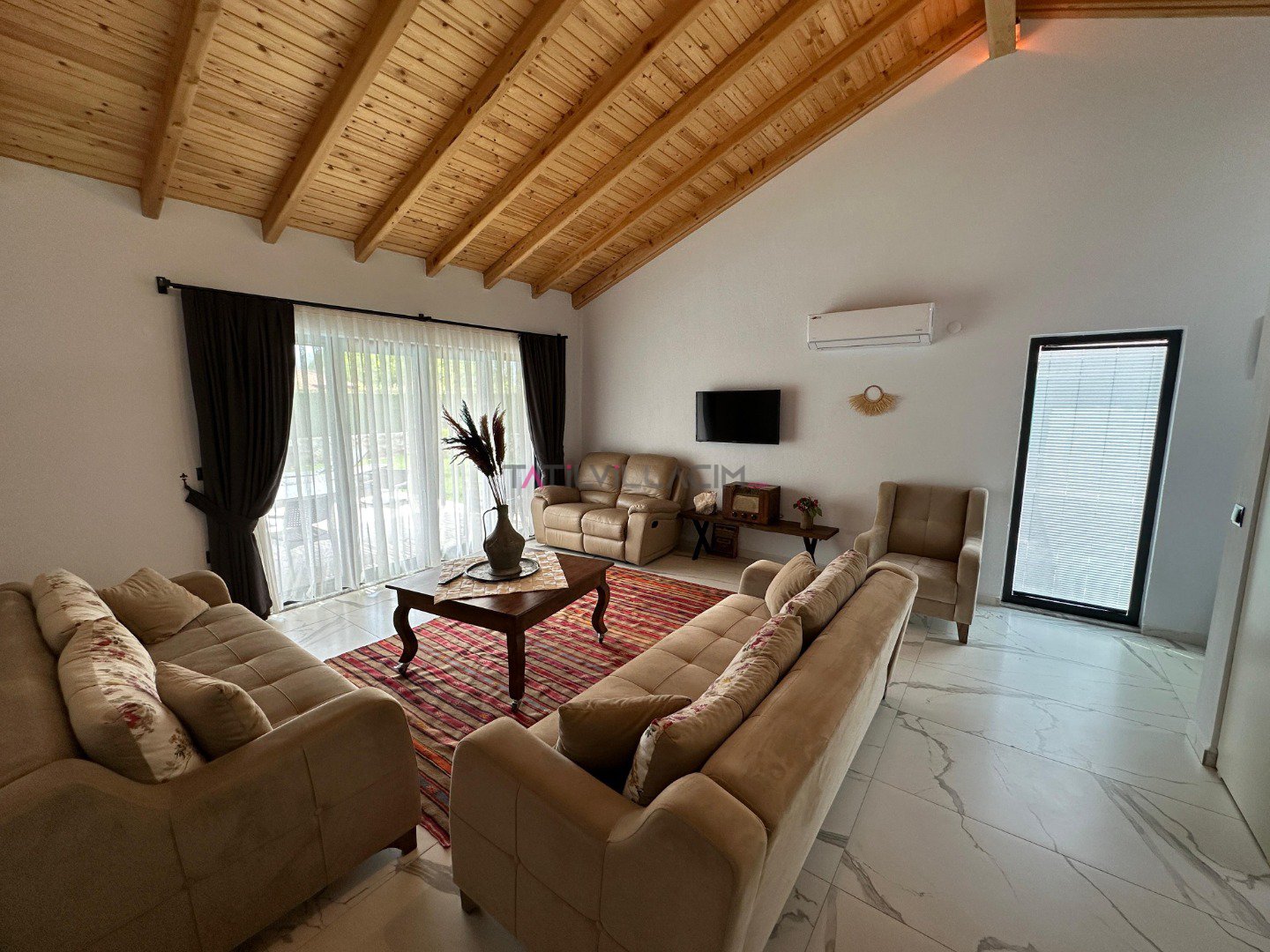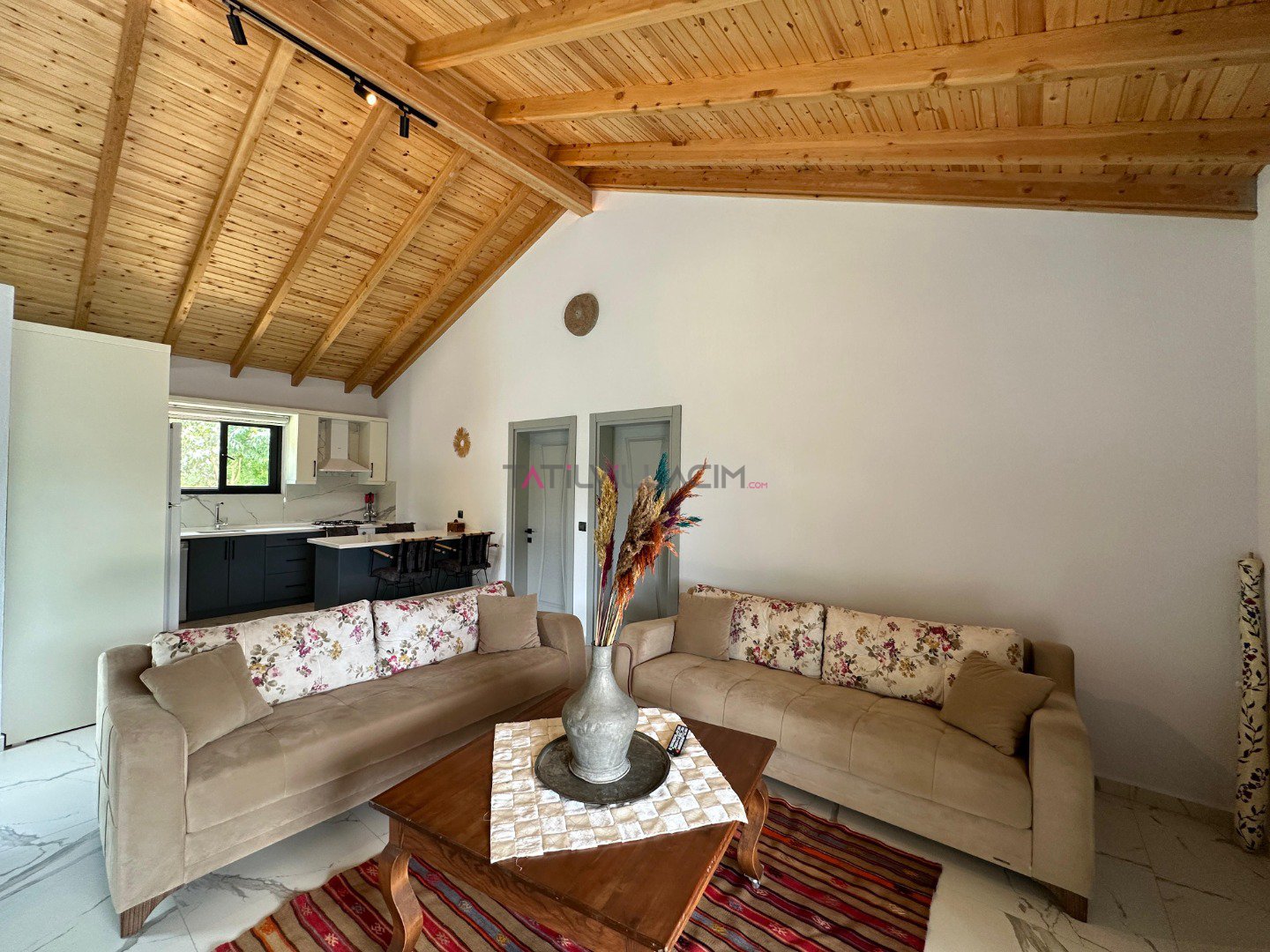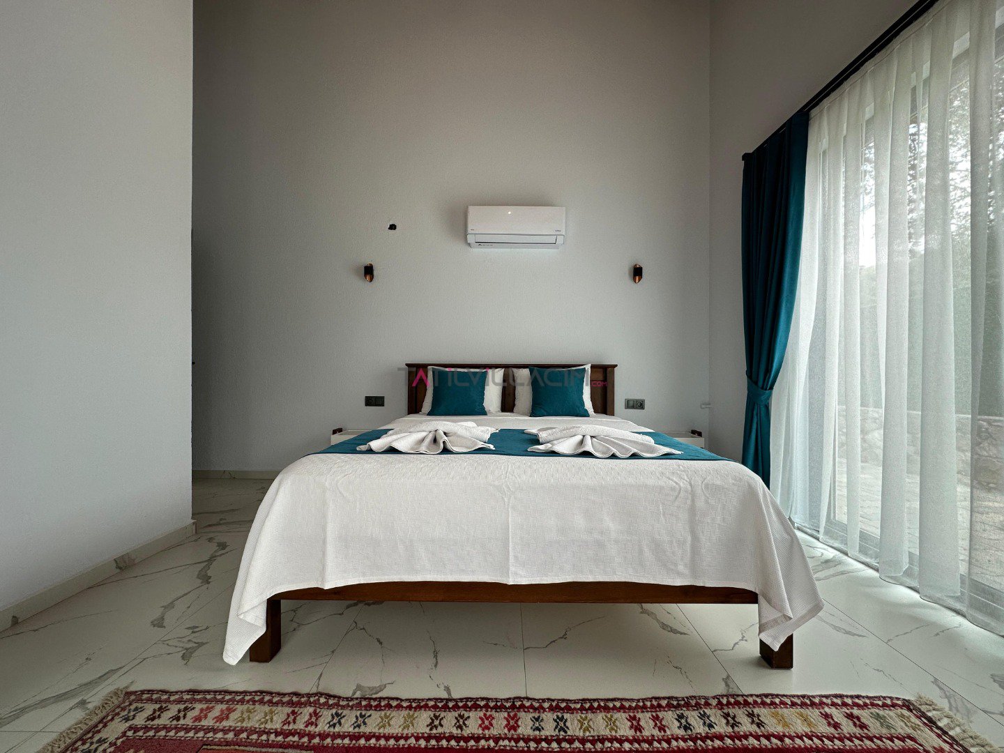 Villamızda 2 yatak odası bulunmaktadır. Ana yatak odasında çift kişilik yatak, ebeveyn banyosu ve klima; diğer yatak odasında ise iki tek kişilik yatak, ebeveyn banyosu ve klima yer almaktadır. Geniş ve ferah açık plan salon ve mutfak, tam donanımlı bir tatil imkanı sunmaktadır. Oturma grubu, klima ve TV ile donatılmış salon, misafirlerimize ev konforu sağlamaktadır.