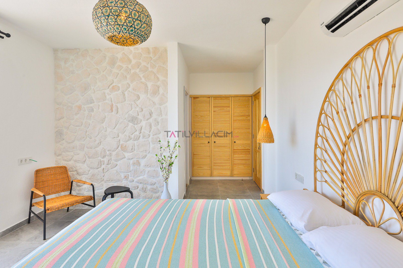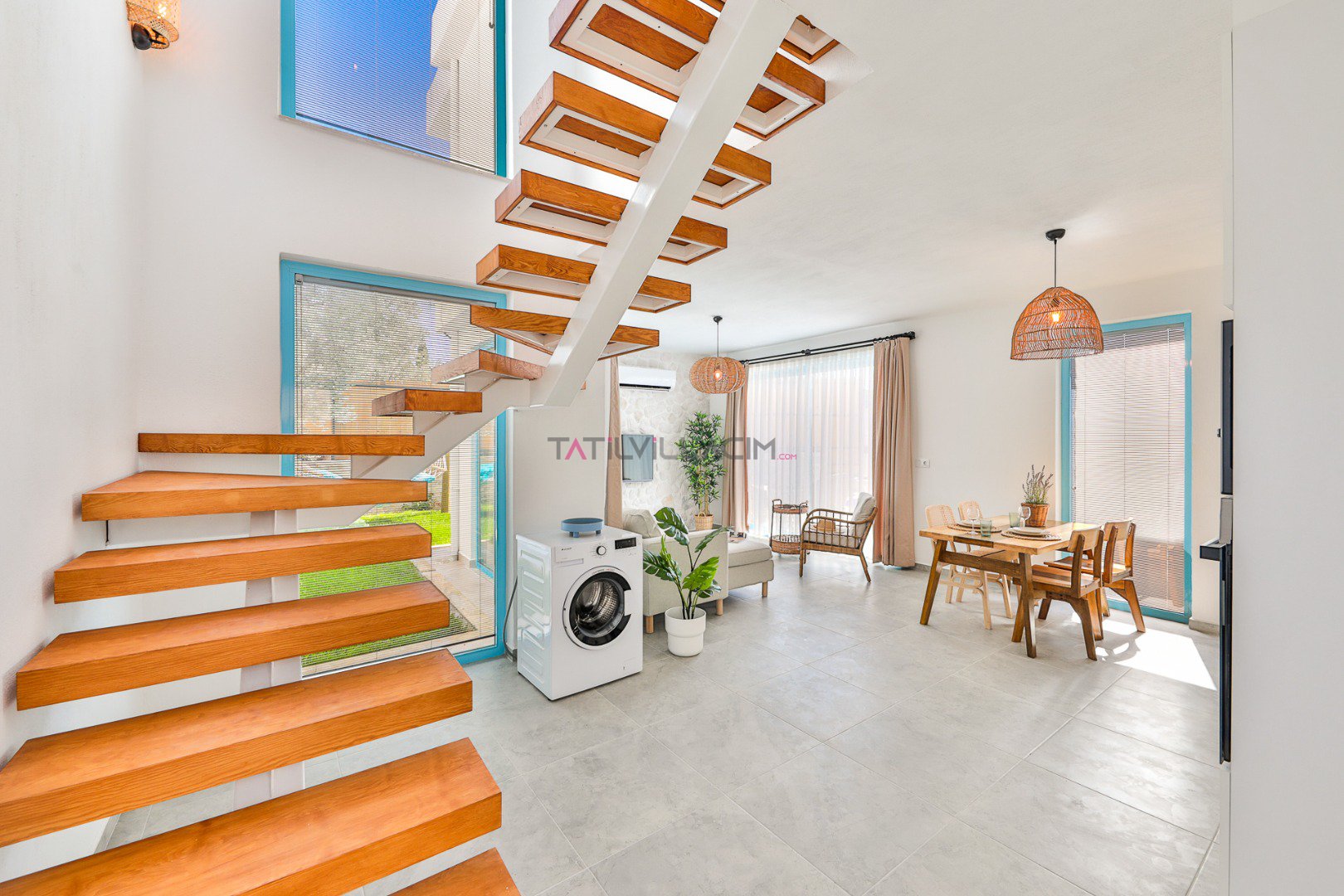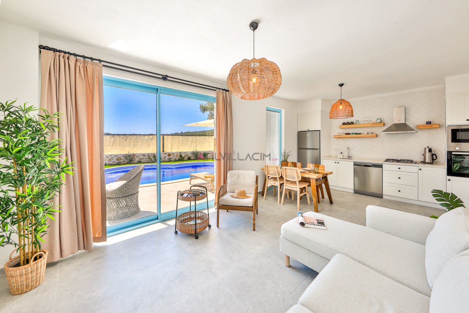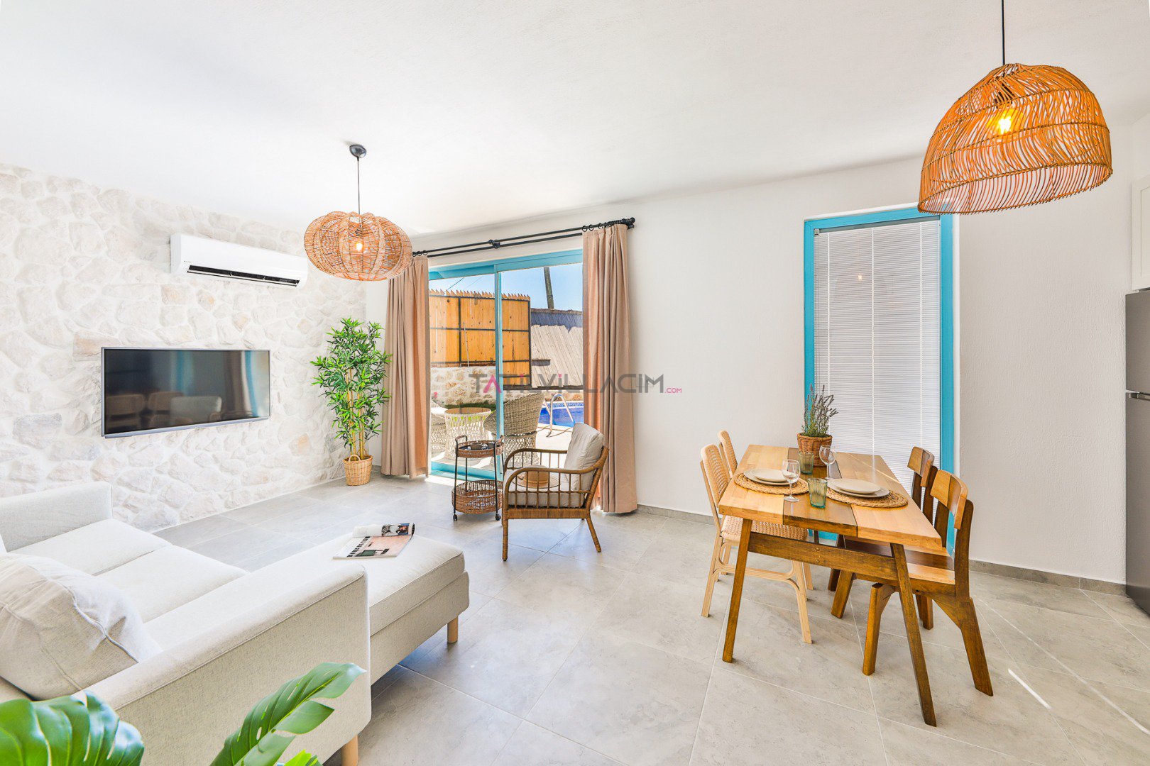 Modern ve ferah salon alanında konforlu oturma grubu, TV ve klima bulunmaktadır. Salondan doğrudan havuz terasına çıkış mevcuttur ve gün boyu bahçe manzarasının keyfini sürebilirsiniz.