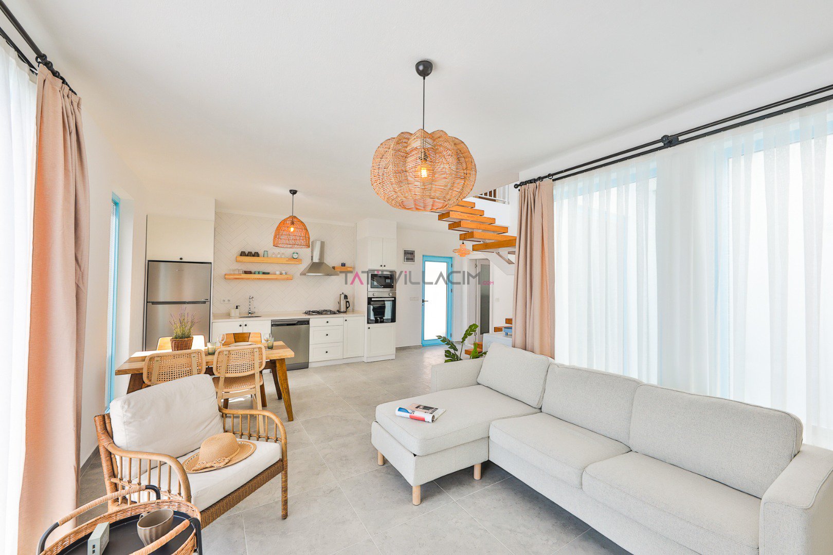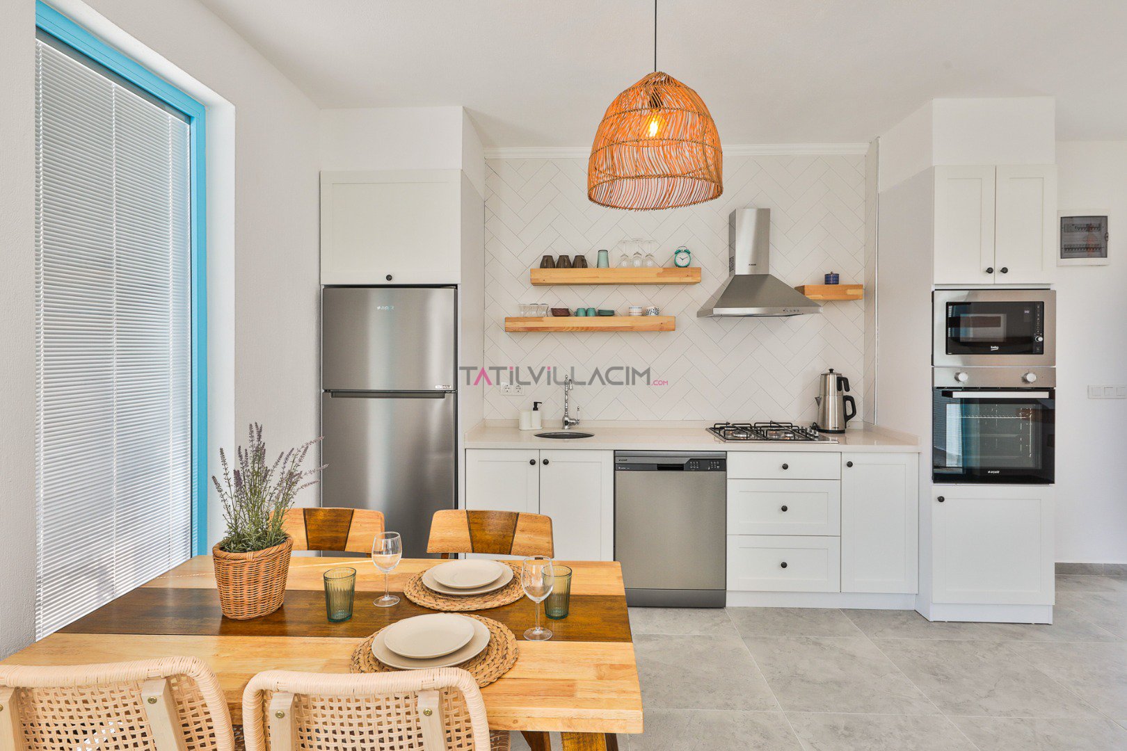 Romantik tatiliniz boyunca ihtiyaç duyabileceğiniz her detay düşünülerek tasarlanan Amerikan mutfak; buzdolabı, bulaşık makinesi, ocak, fırın, yemek masası, yemek takımı ve tüm temel yemek pişirme araç-gereçleri ile eksiksizdir.