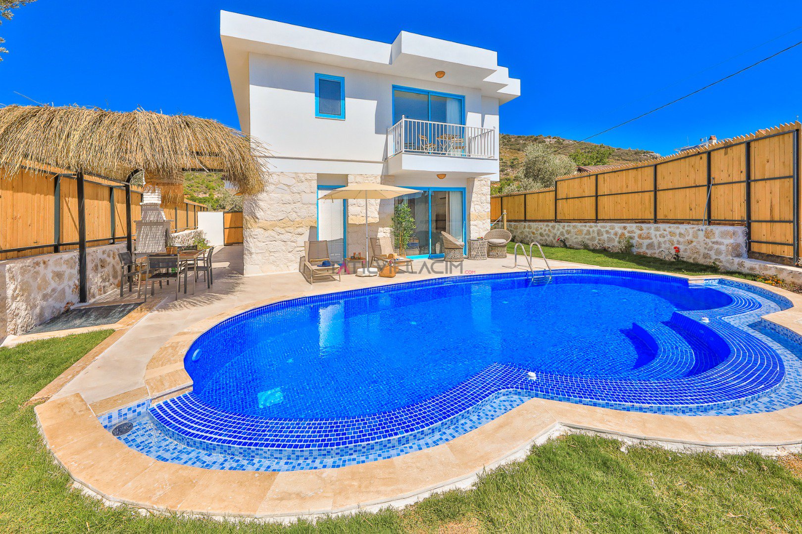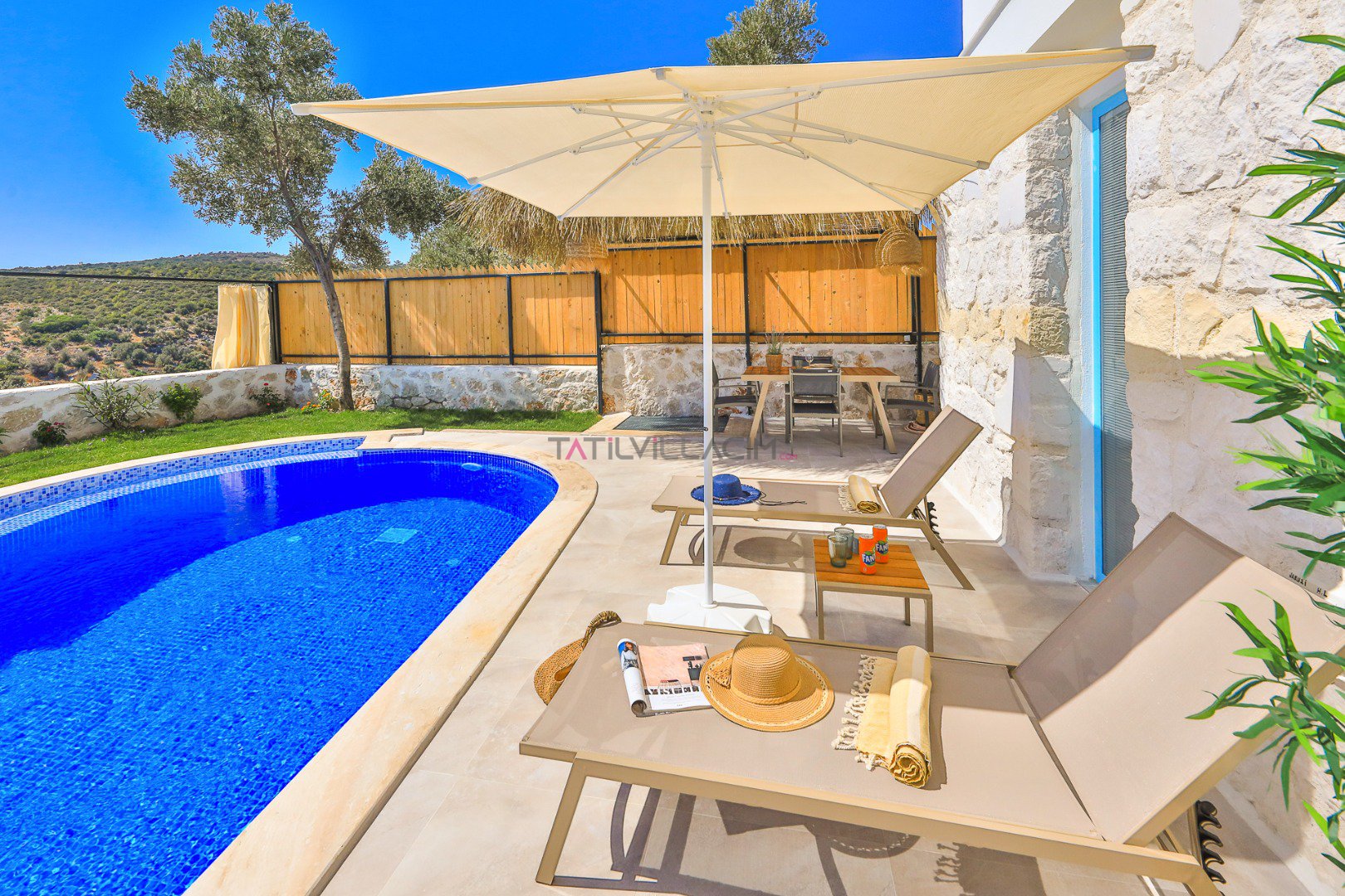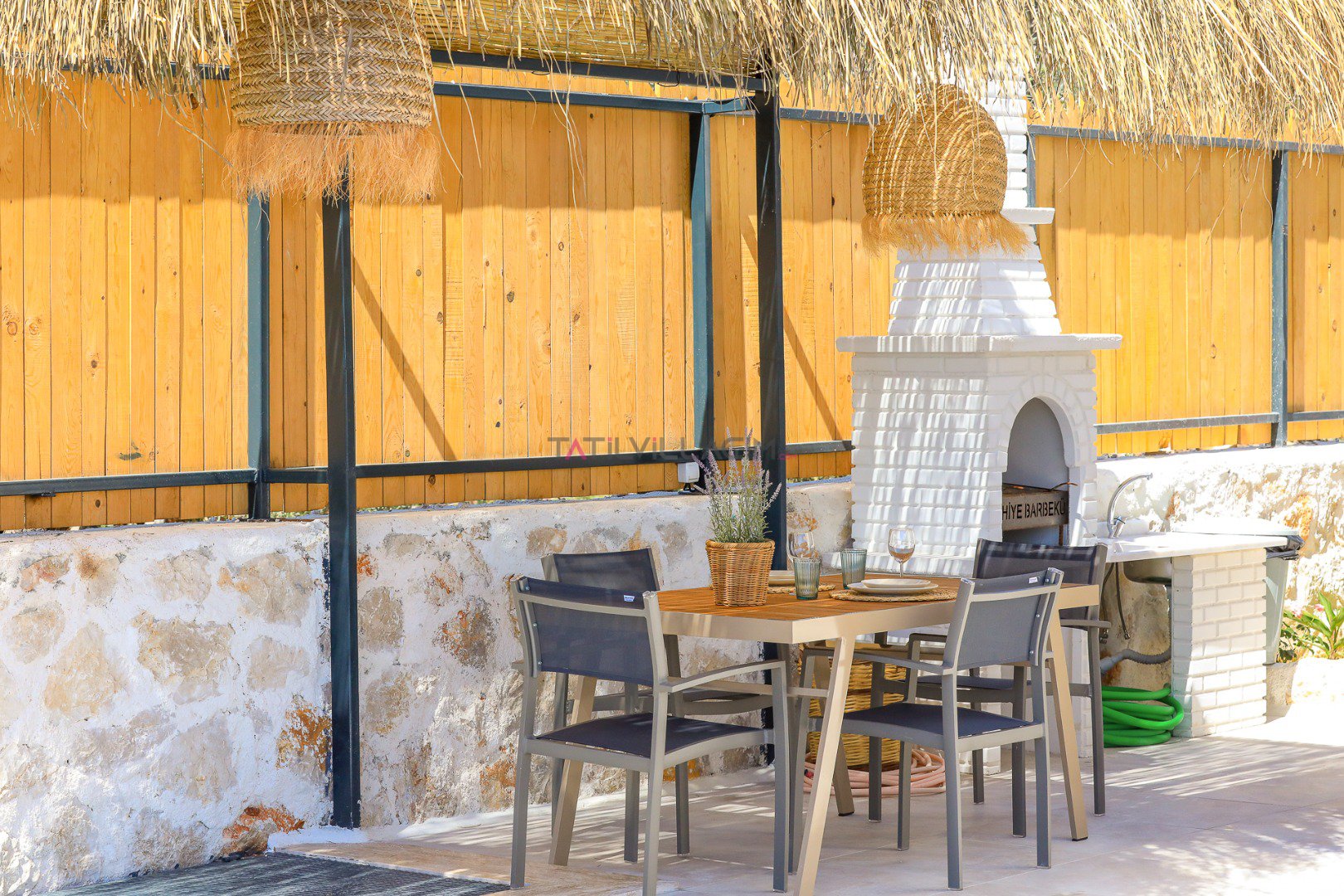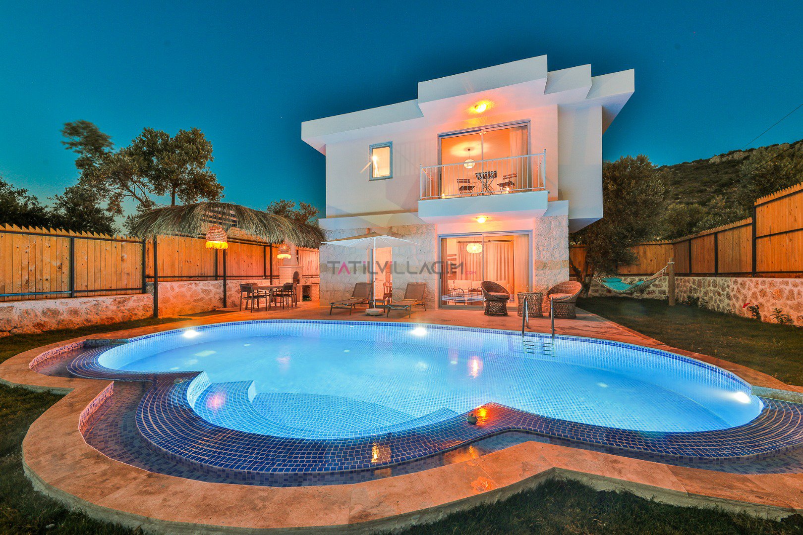 Villanın özel bahçesinde; size ait yüzme havuzu, şezlonglar, güneş şemsiyeleri, salıncak, açık hava yemek masası ve barbekü alanı yer almaktadır. Gün batımında havuz başında romantik anlar yaşayabilir, yıldızlar altında keyifli akşam yemekleriyle tatilinizi taçlandırabilirsiniz.