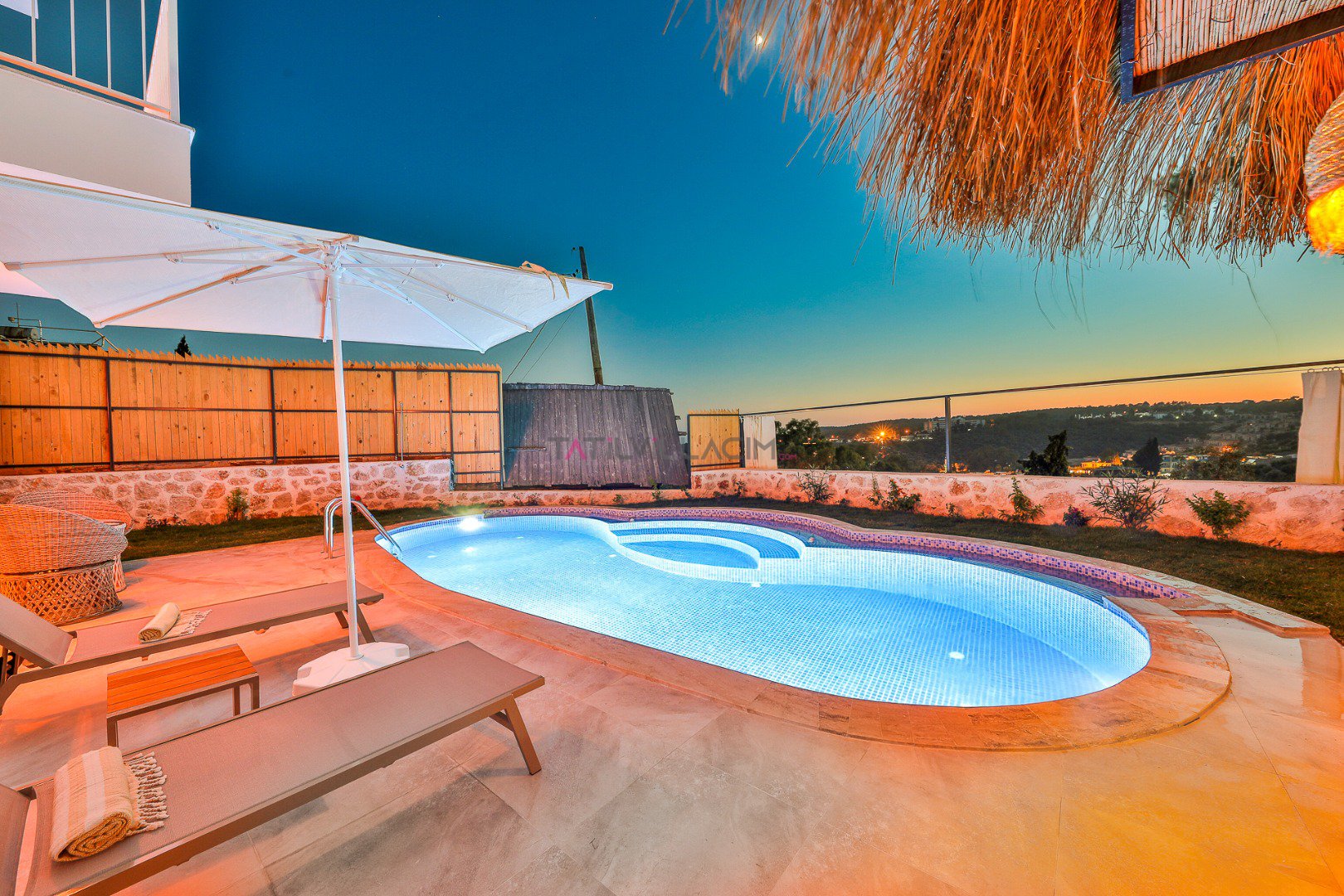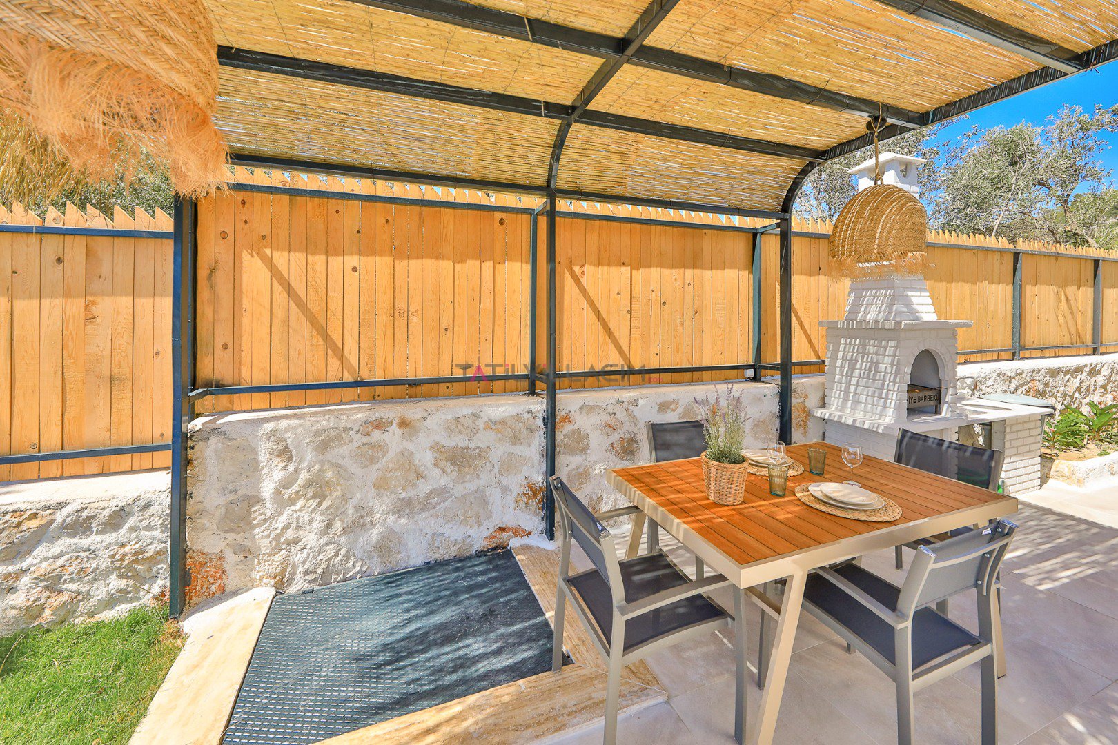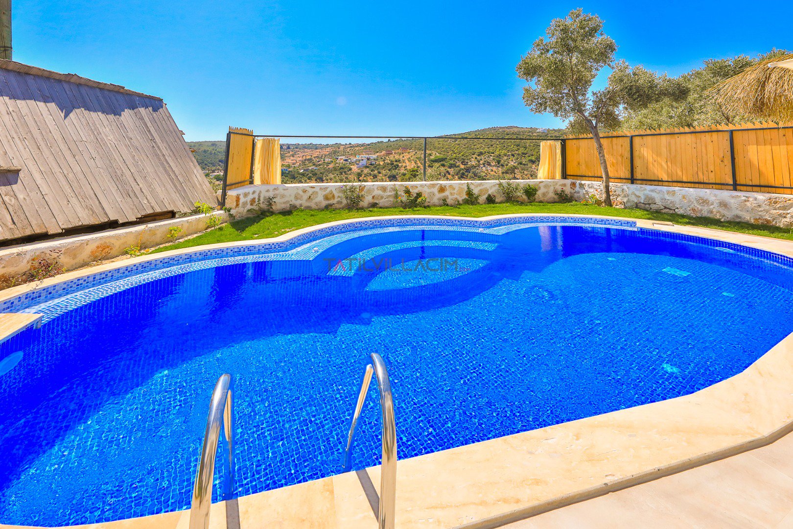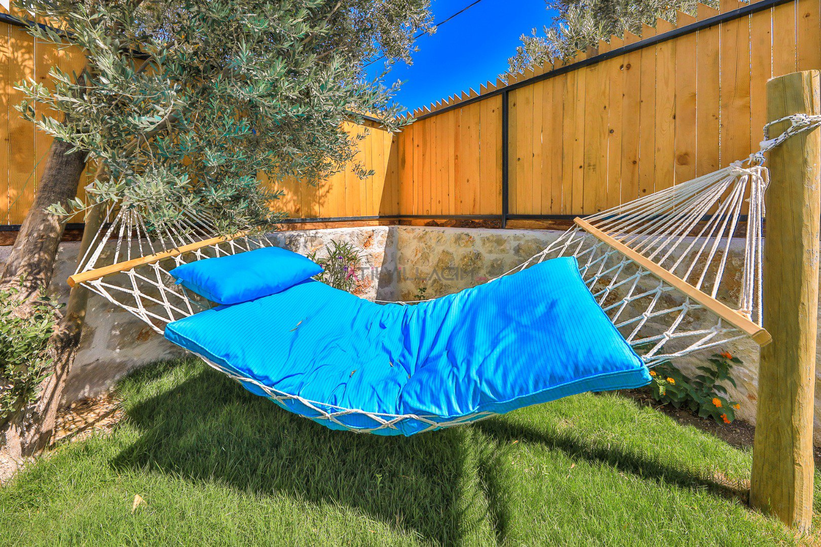 Villanın özel bahçesinde; size ait yüzme havuzu, şezlonglar, güneş şemsiyeleri, salıncak, açık hava yemek masası ve barbekü alanı yer almaktadır. Gün batımında havuz başında romantik anlar yaşayabilir, yıldızlar altında keyifli akşam yemekleriyle tatilinizi taçlandırabilirsiniz.