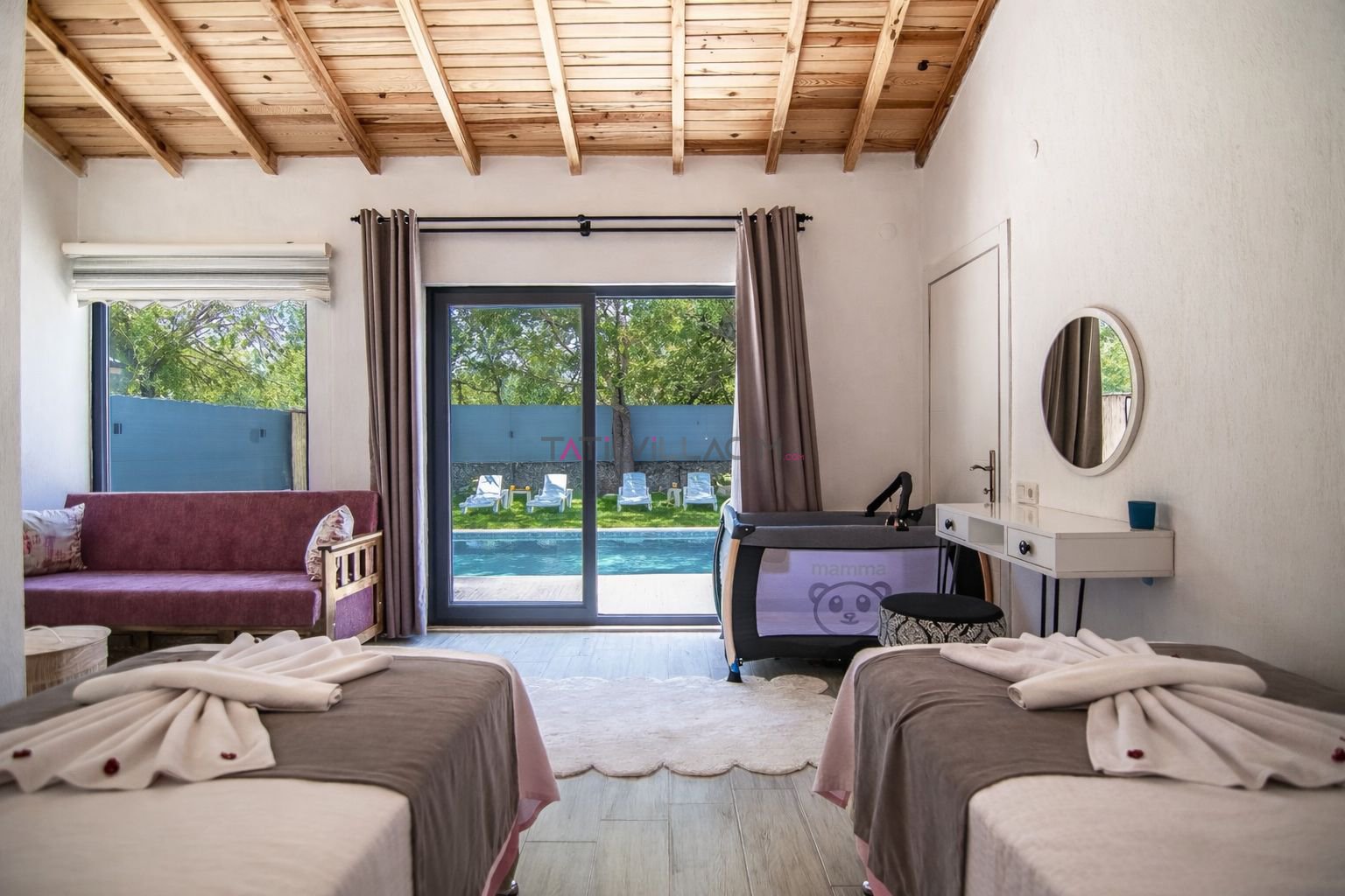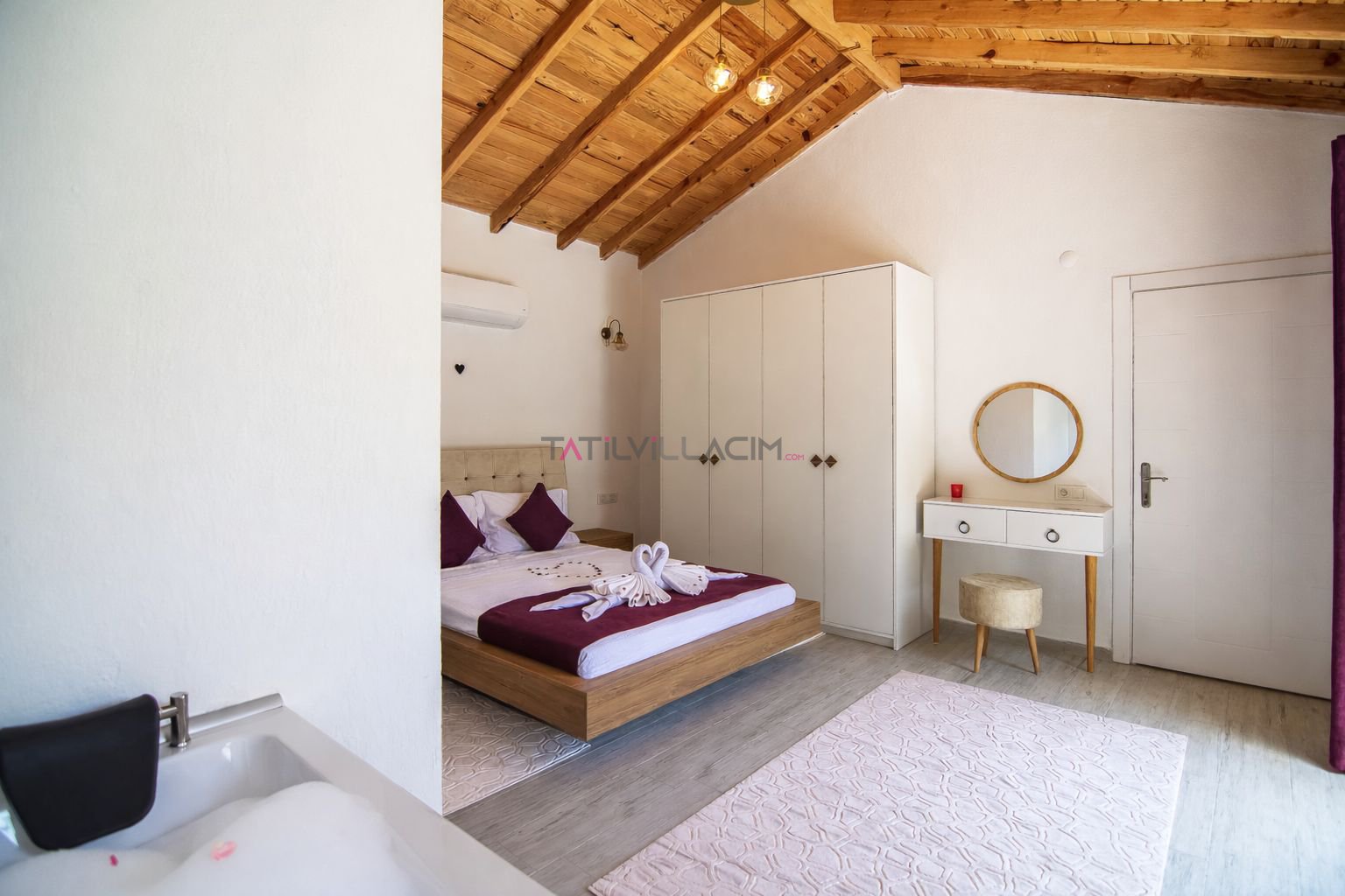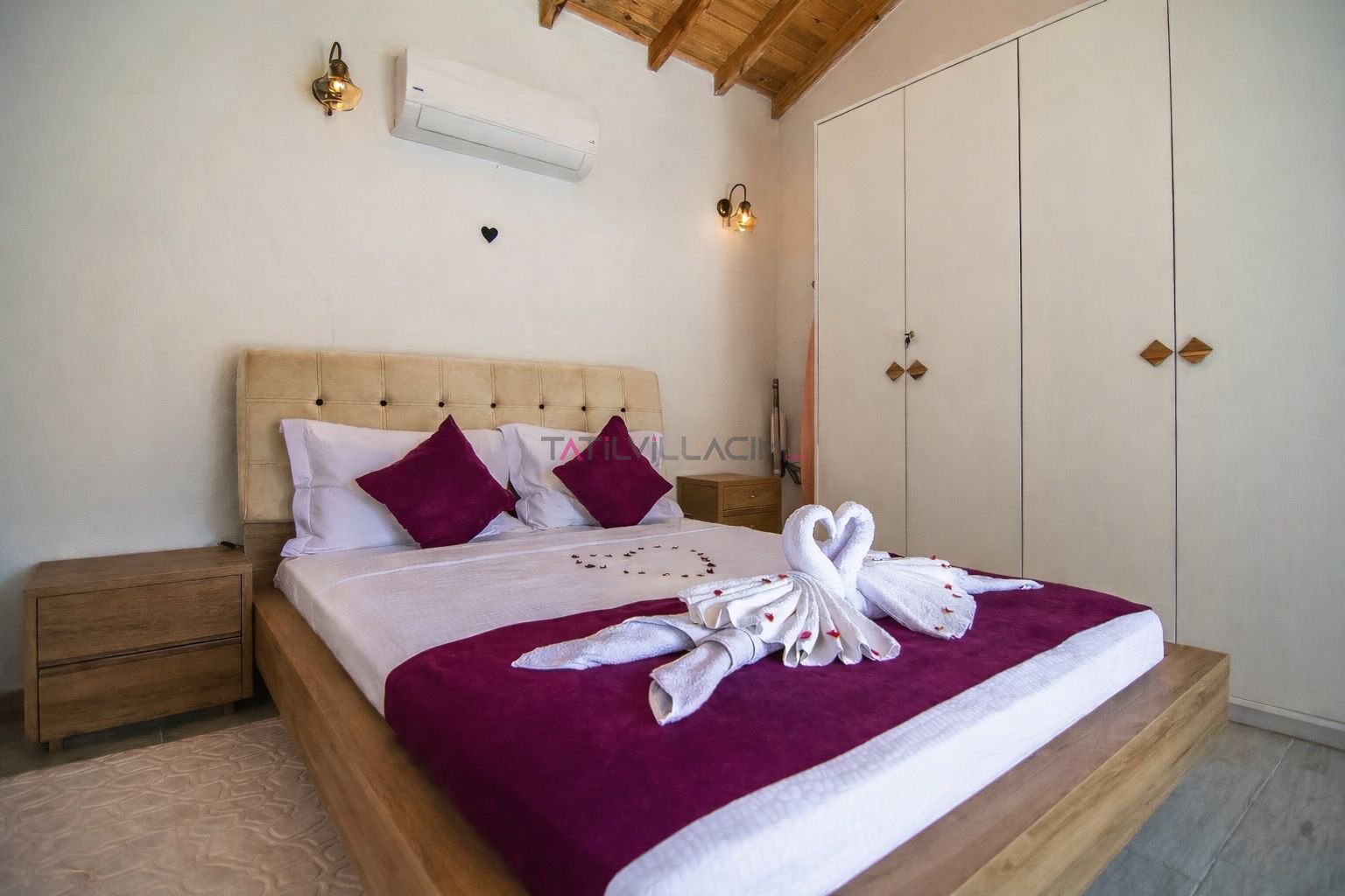 Birinci yatak odasında çift kişilik yatak, jakuzi ve özel banyo yer almakta olup, özellikle balayı tatili planlayan çiftler için romantik ve rahatlatıcı bir atmosfer sunar. İkinci yatak odasında ise iki tek kişilik yatak ve banyo bulunmaktadır. Modern ve sade dekorasyonu ile villa, konforlu bir konaklama deneyimi sağlar.