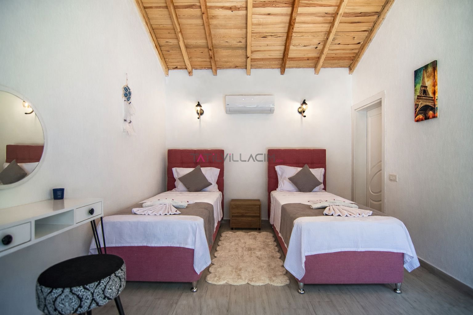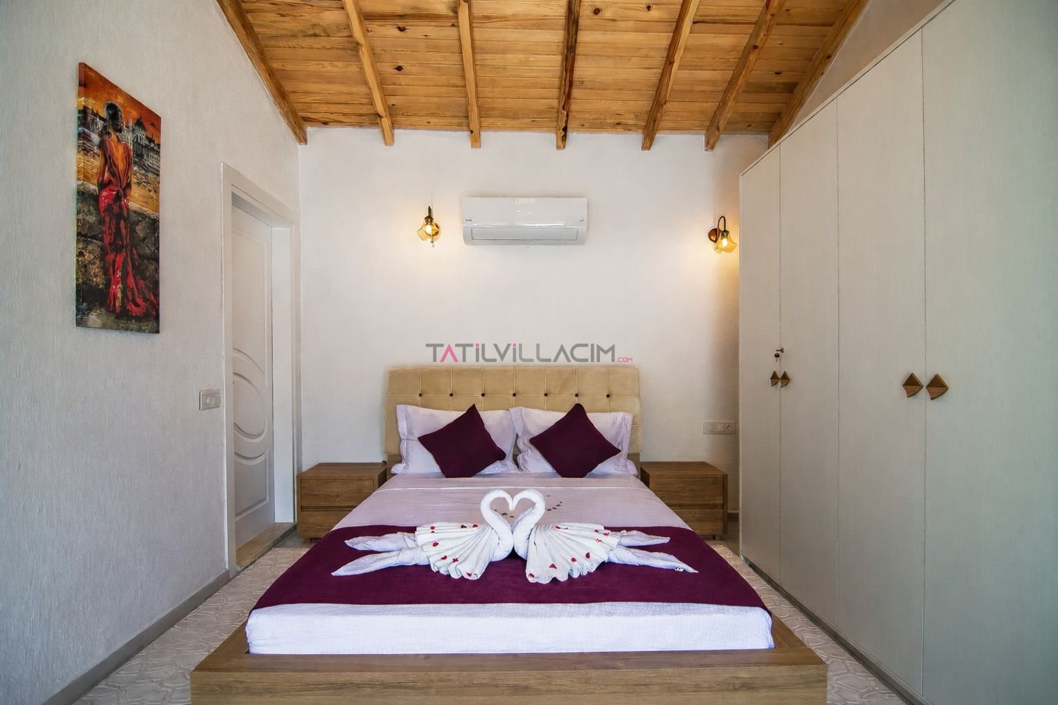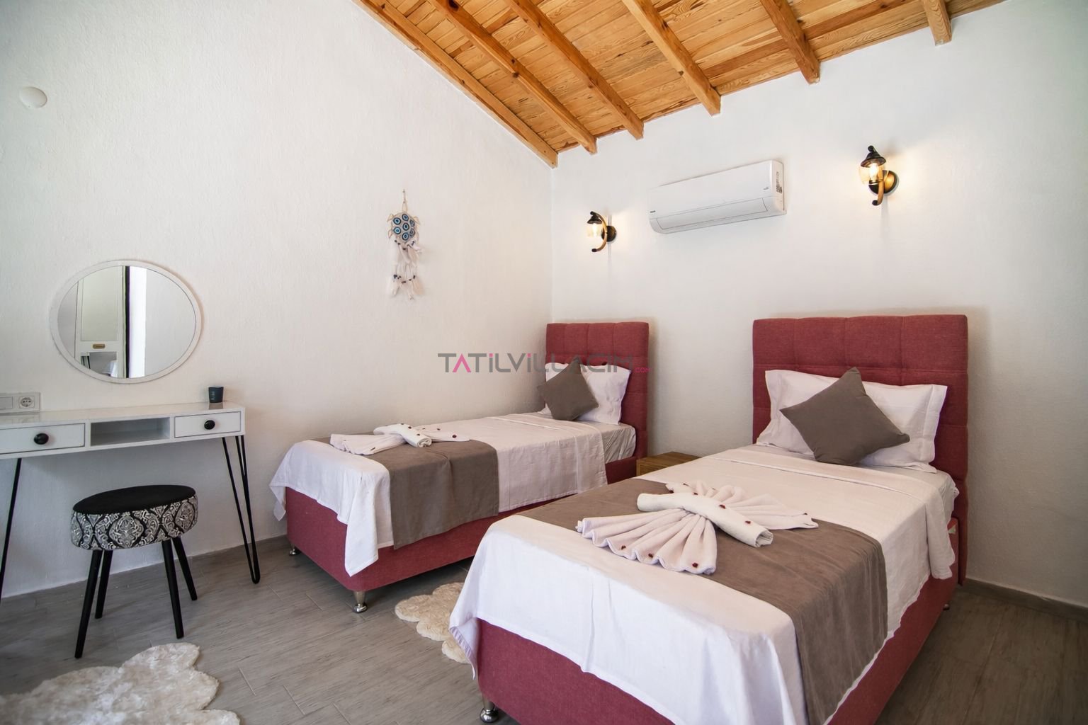 Birinci yatak odasında çift kişilik yatak, jakuzi ve özel banyo yer almakta olup, özellikle balayı tatili planlayan çiftler için romantik ve rahatlatıcı bir atmosfer sunar. İkinci yatak odasında ise iki tek kişilik yatak ve banyo bulunmaktadır. Modern ve sade dekorasyonu ile villa, konforlu bir konaklama deneyimi sağlar.