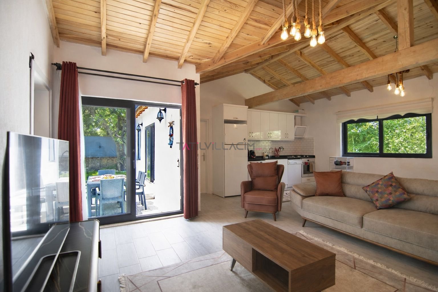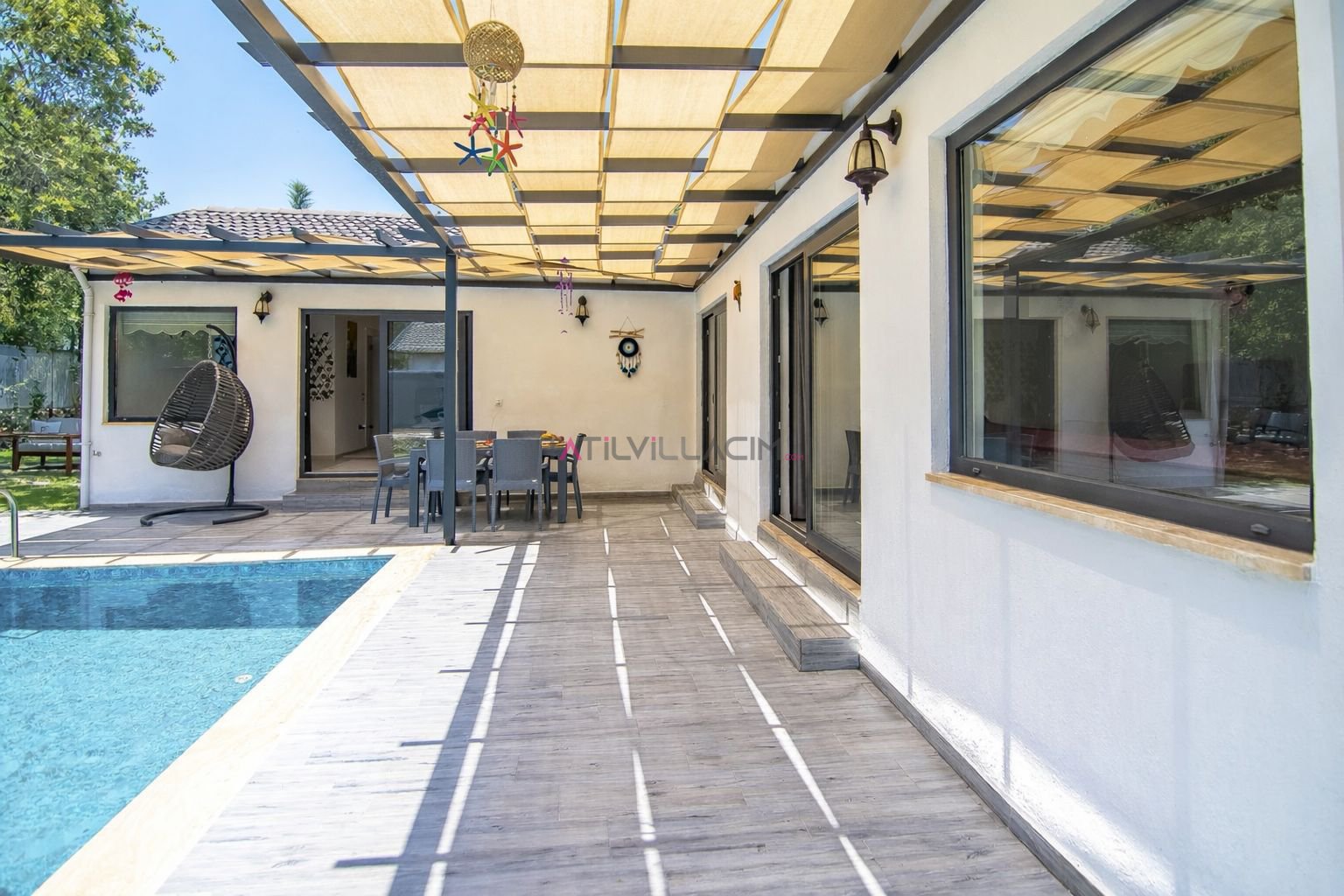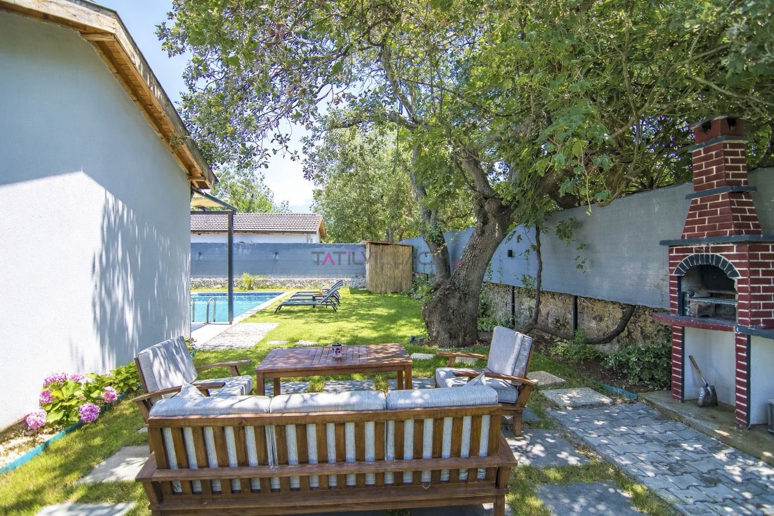 Villanın bahçesinde yer alan özel havuz alanı ve yeşillikler içindeki oturma bölümü, güne huzurlu bir kahvaltıyla başlamak veya akşam saatlerinde doğanın sessizliğinde dinlenmek için keyifli bir ortam oluşturur. Doğa ile iç içe konumuna rağmen deniz ve plaj alanlarına yakın mesafede bulunması, tatilinizi daha da avantajlı hale getirir.