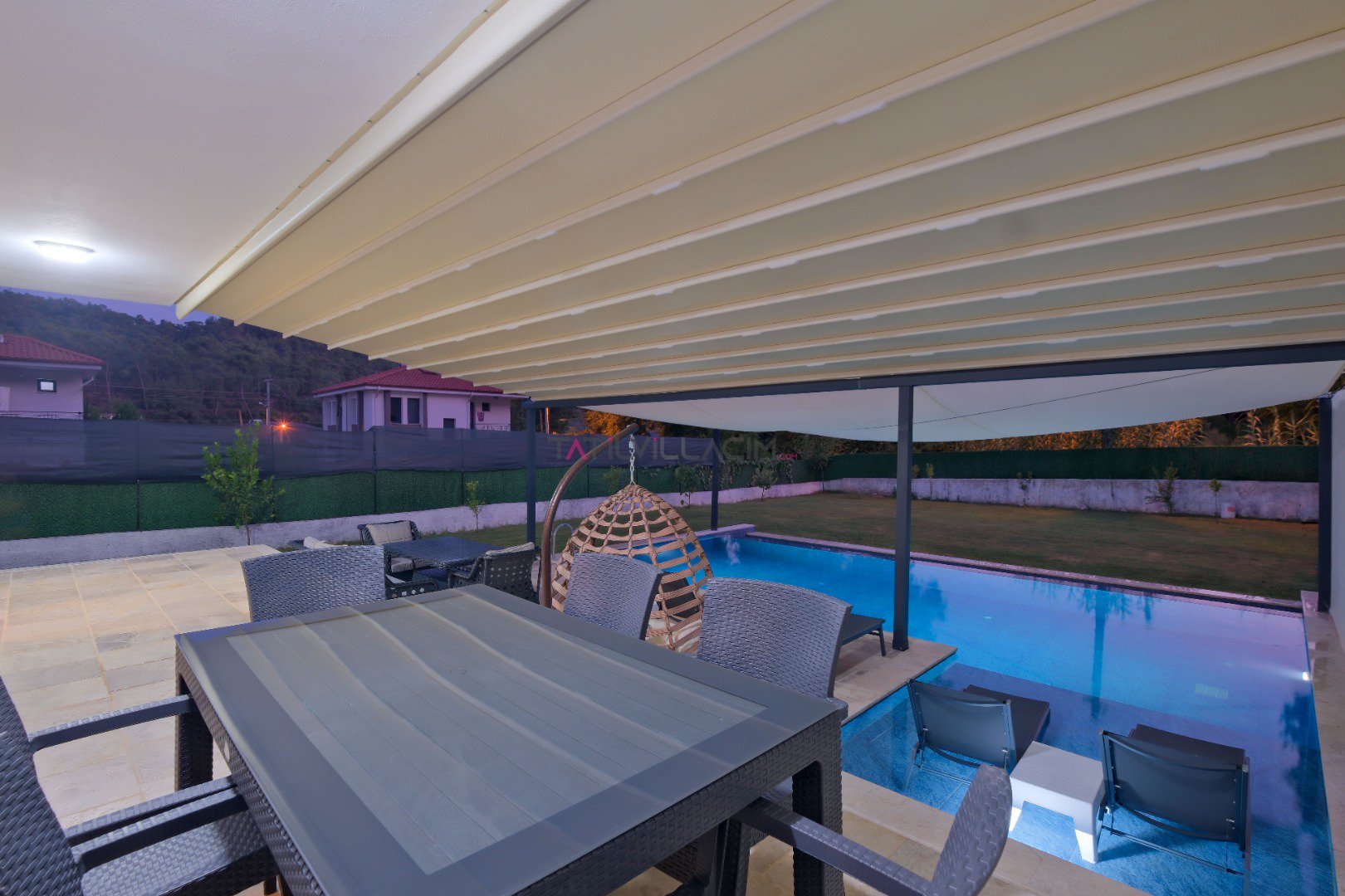 Havuz Katı Terası: Güneşlenme alanı, özel havuz, çocuk havuzu, özel bahçe ve park yeri. Ayrıca 8 kişilik yemek masası, oturma grubu ve 4 adet şezlong bulunmaktadır.