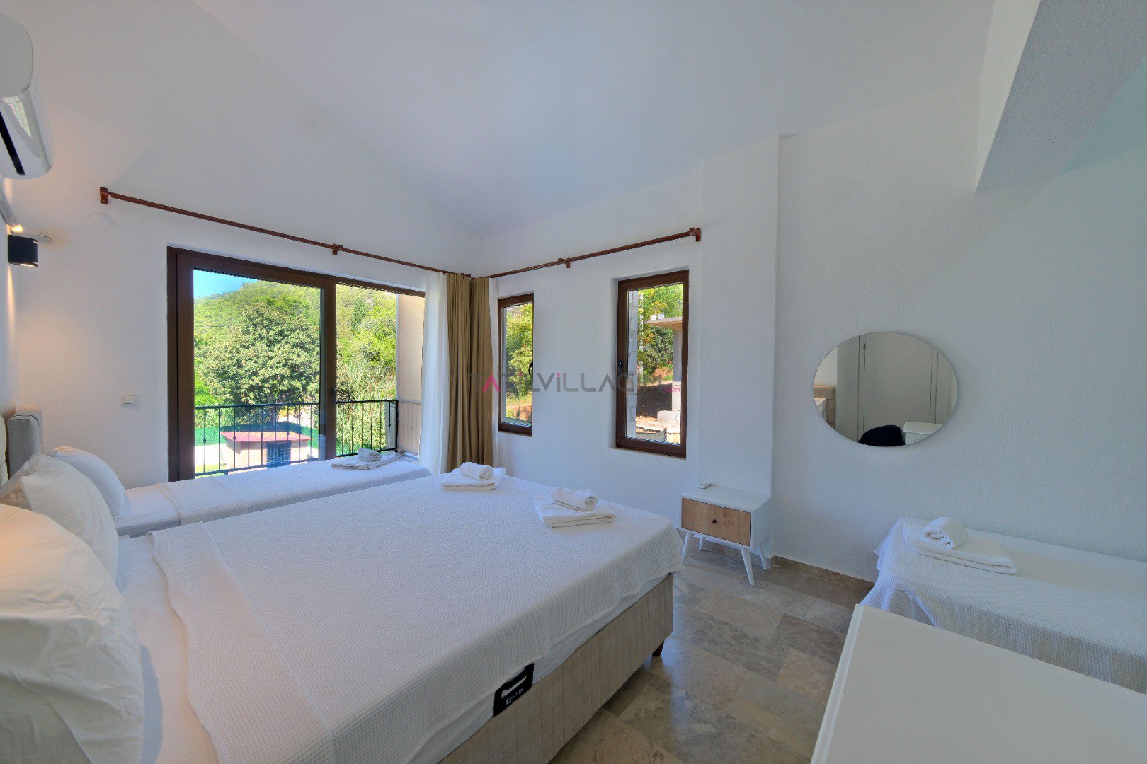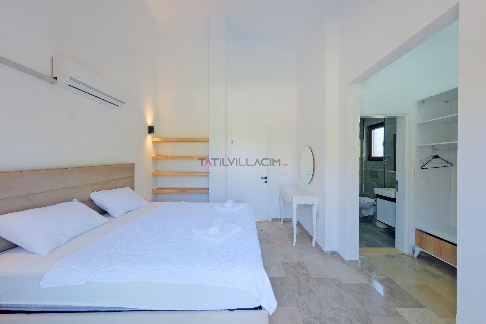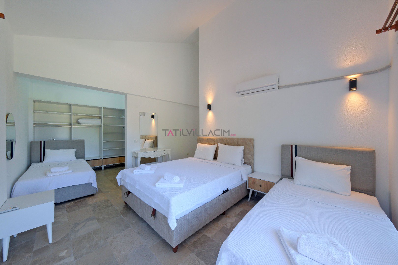 Yatak Odası 3 (1. Kat - Suit): Çift kişilik yatak, 2 adet tek kişilik yatak, komodin, klima, elbise dolabı, makyaj masası, balkon ve ebeveyn banyosu.