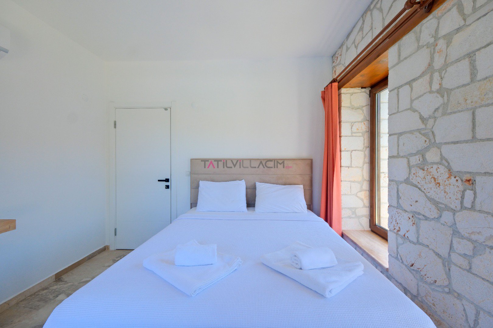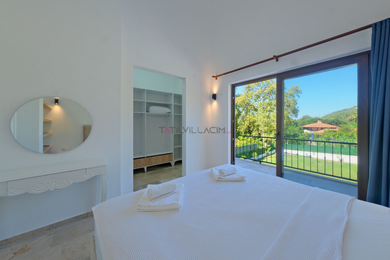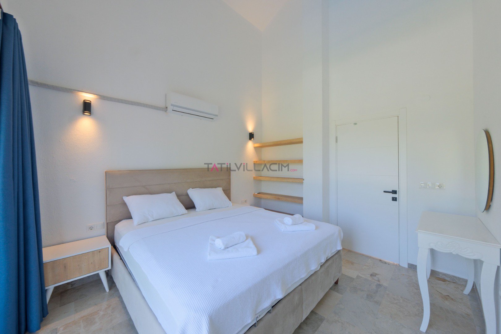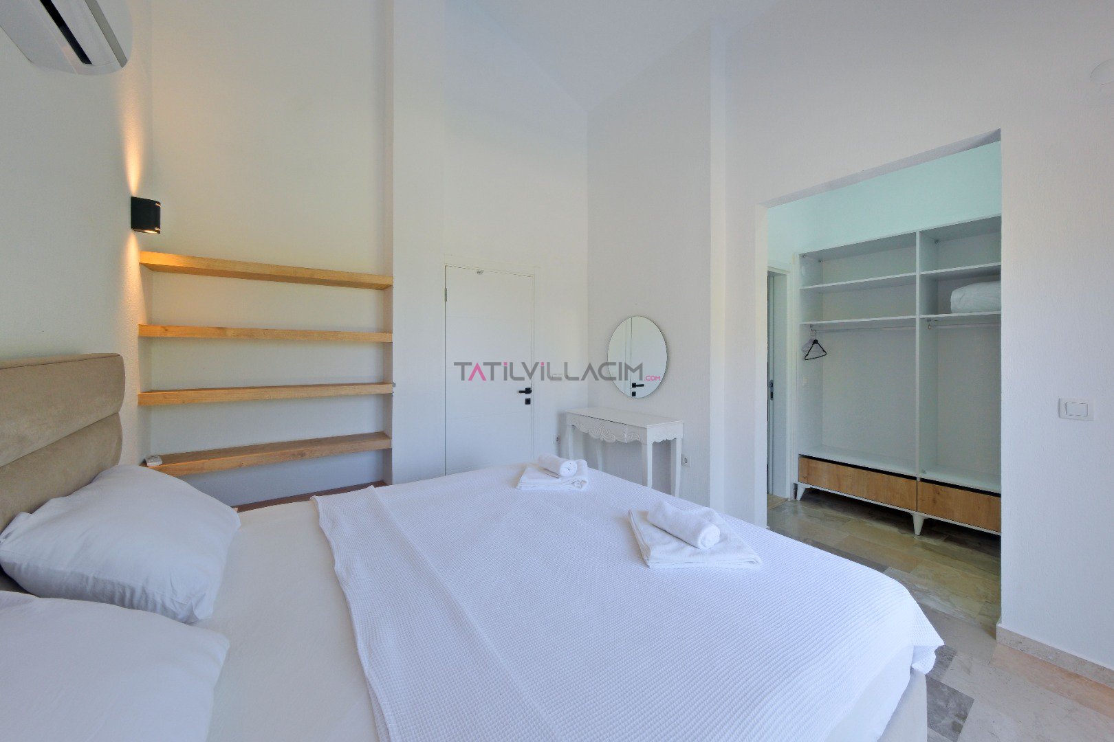 Yatak Odası 3 (1. Kat - Suit): Çift kişilik yatak, 2 adet tek kişilik yatak, komodin, klima, elbise dolabı, makyaj masası, balkon ve ebeveyn banyosu.