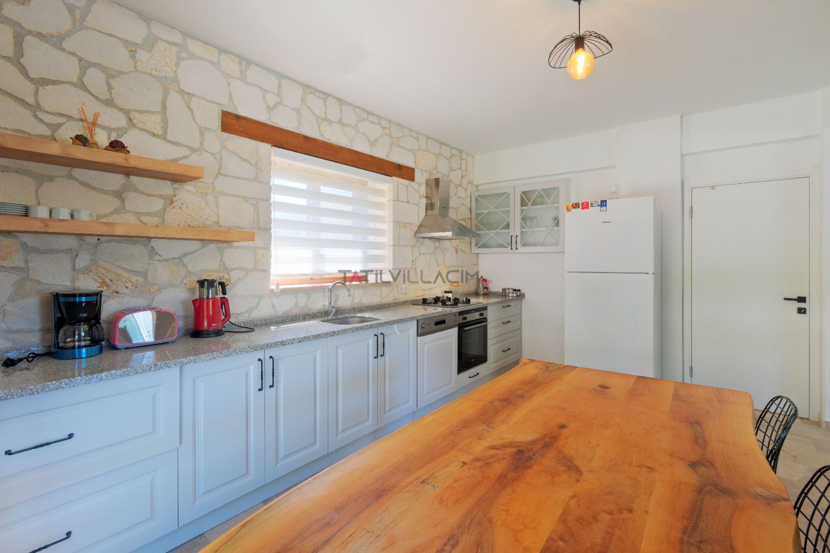 Mutfak (Zemin Kat): Modern mutfakta buzdolabı, bulaşık makinesi, çamaşır makinesi, fırın, 4’lü ocak, elektrikli su ısıtıcı, Türk kahve makinesi, filtre kahve makinesi, çaycı ve 8 kişilik yemek takımı bulunmaktadır.