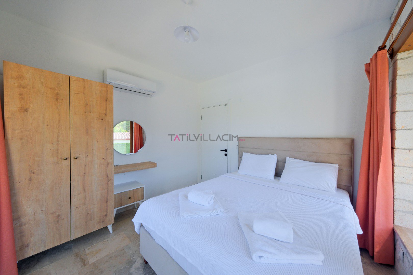 Yatak Odası 1 (Zemin Kat): Çift kişilik yatak, komodin, klima, elbise dolabı, makyaj masası, balkon ve koridorda bir banyo yer almaktadır.